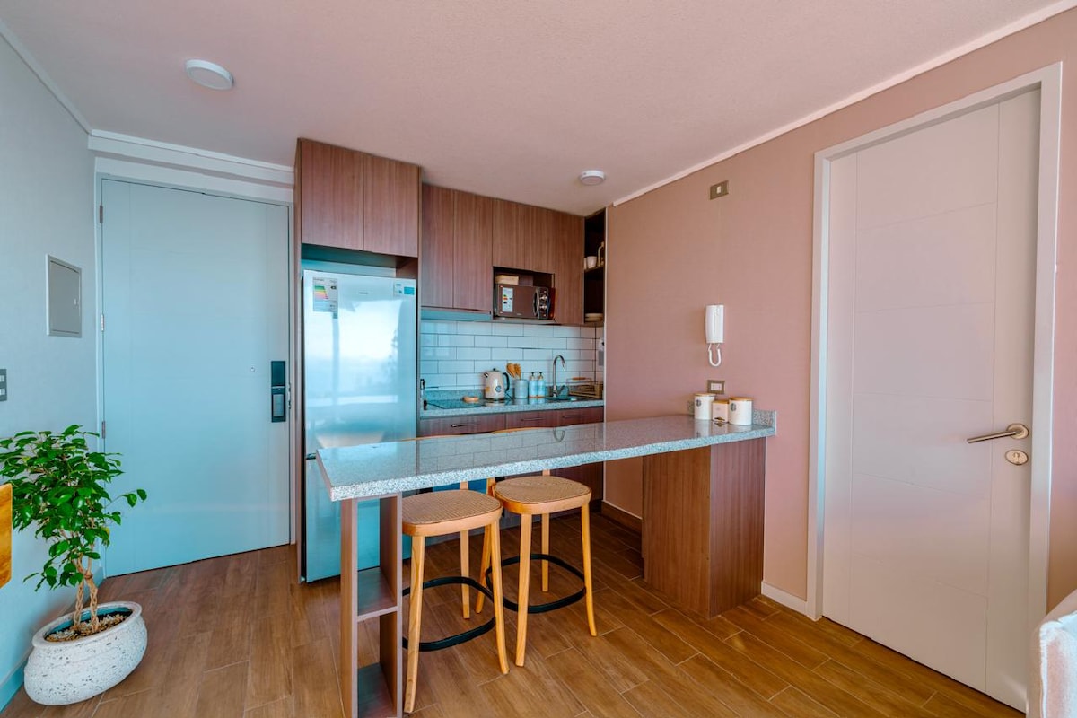 Dpto. Entrada autónoma, vista al mar y parking privado indoor. full amoblado, sector lider express A 10 min del centro. A 2 cuadras a pies de super lider express. A 5 min de la Municipalidad. A 3 min del Hospital Regional. A 3 min del terminal de buses. A 30 min del aeropuerto. Wifi y televisor smart tv de 43”, con Netflix, HBO premium. Cocina full equipada; Hervidor, horno eléctrico, microondas y lavadora secadora sillón reclinable. Silla reposera con vista al mar Conserjería 24 hr