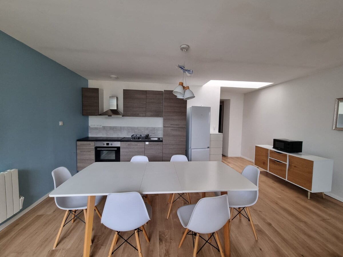 Bienvenue dans ce charmant appartement style loft de 80 m2 , situé à 1 minute en voiture du centre de Valenciennes. 10 mn à pieds de la gare. Cet hébergement est parfait pour les couples, amis ou voyageurs de passage souhaitant visiter les villes proches Valenciennes, Mons, Tournai, Lille.... Vous trouverez toutes les commodités nécessaires à quelques minutes de marche ; tram, gare, Friterie, boulangerie, restaurants, pharmacie, centre médical, garage...RubiKa, Lycée de l'Escaut ....