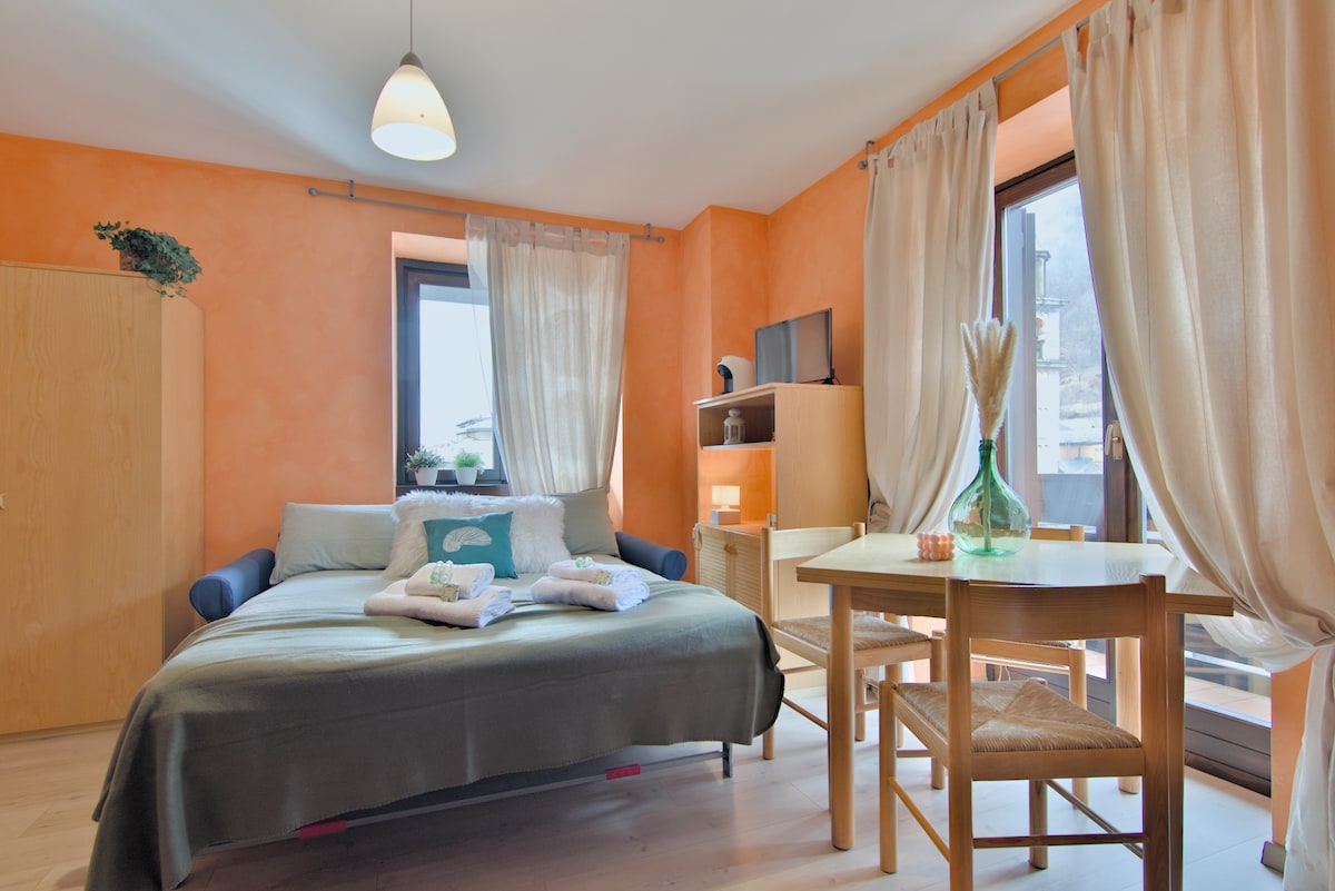 In the lively city center, just a stone's throw from the Palabione slopes, our studio welcomes up to 4 guests with a comfortable sofa bed and custom bunk bed. Admire the majestic mountains from the balcony, whip up delicious meals in the fully-equipped kitchen, and unwind in the modern bathroom area. The private covered parking completes the experience. Get ready for a unique immersion in Aprica, where art and comfort blend in perfect harmony!