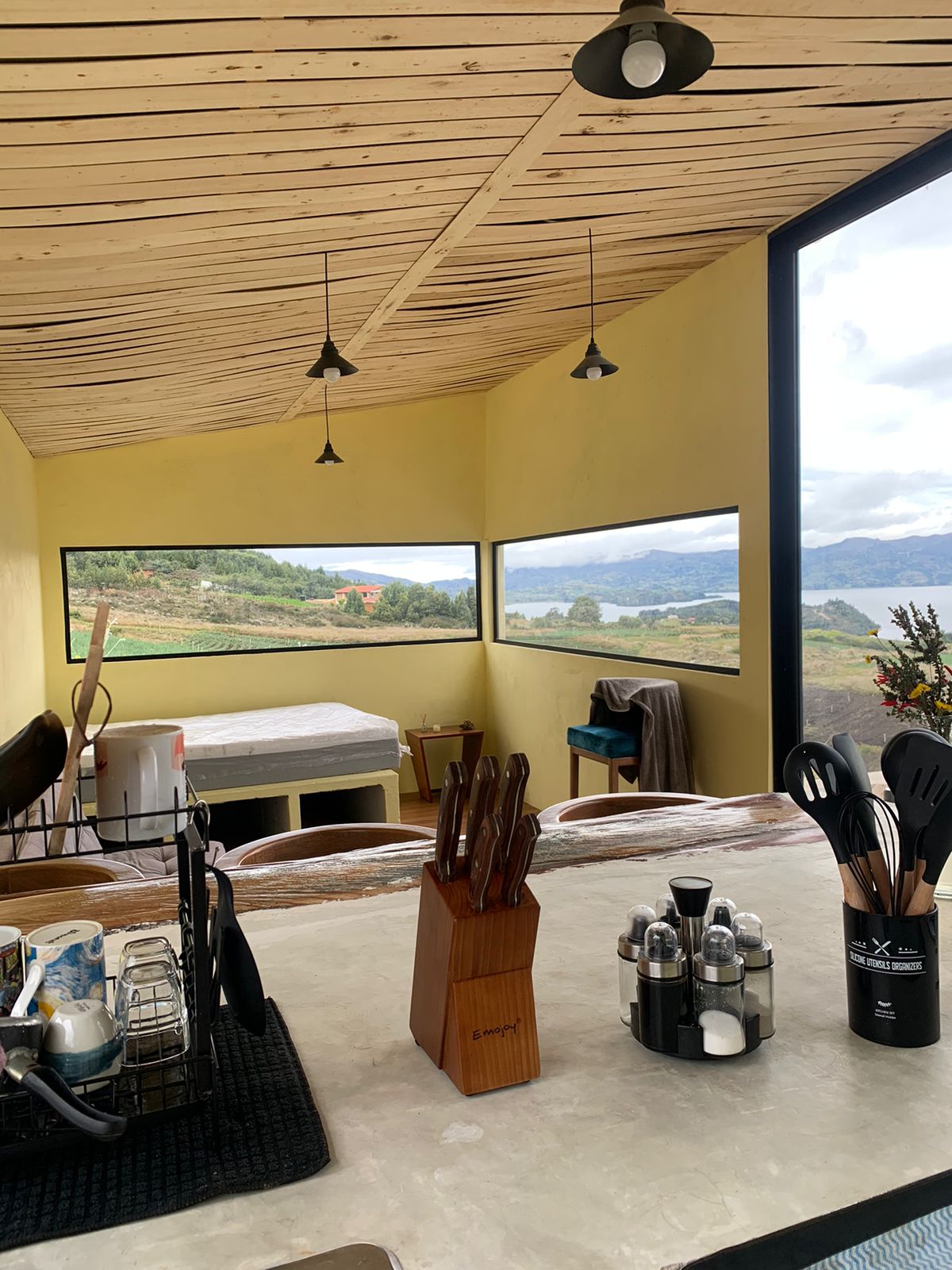 Chalé con fogata exterior y WIFI, Pet friendly! RESTAURANTE A DOMICILIO Diseñado para el confort, cuenta con vista a la LAGUNA DE TOTA desde la comodidad de la cama, bien equipada con nevera, microondas, sanduchera, hervidor de agua eléctrico, estufa de inducción sus utensilios, platos, vasos, cucharas, te dejamos café, panela, azúcar, aromáticas, sal, aceite, también hay copas, destapa corchos. En el baño puedes encontrar toallas, jabón de manos, jabón de cuerpo y champo.
