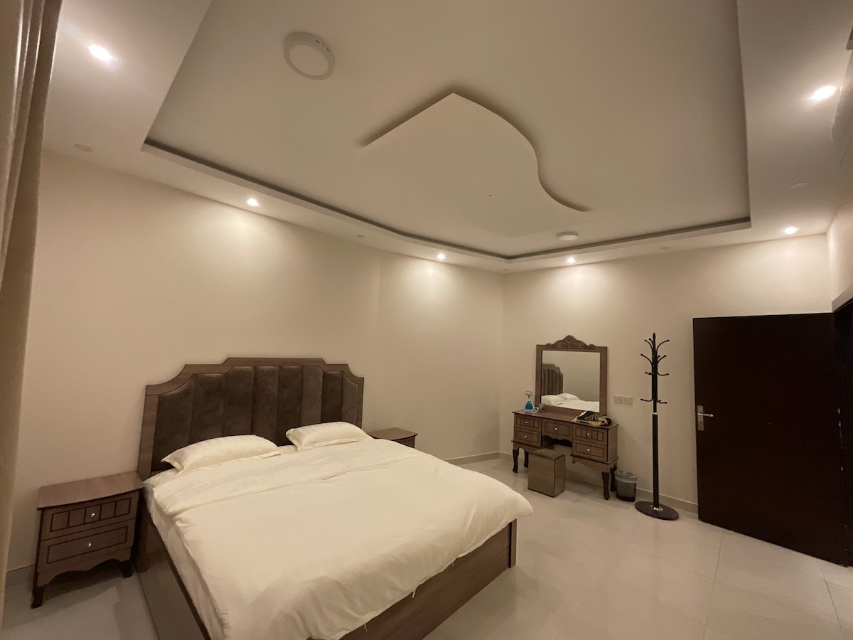 شقة بتصميم مودرن وتشطيبات فندقية غرفة نوم واسعة بسرير مريح وإضاءة هادئة ركنة أنيقة مع ديكور جذاب ولمسات فخمة شاشة سمارت كبيرة + ركن مكتب ومرآة مضيئة إضاءة LED عصرية تعطي جو راقي ومريح ديكورات مميزة ولوحات فنية تضيف لمسة فخامة نظافة وتعقيم دائم