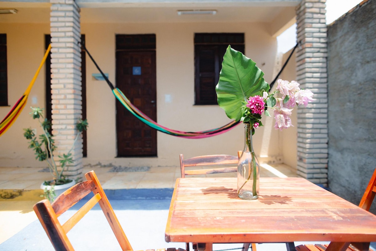 Casa de 2 andares, ampla e arejada, com varanda e vista para o mar. Está localizada a 100m da praia e 600m da rua principal (Broadway), num bairro tranquilo e rodeado de pousadas com segurança, próxima às barracas novas de Canoa. Os quartos possuem ventiladores e lençóis nas camas. A cozinha está equipada com o básico: pratos, talheres, copos, xícaras, panelas, cuscuzeira e liquidificador, além de alguns temperos. Há 2 banheiros , e uma ducha externa, no quintal