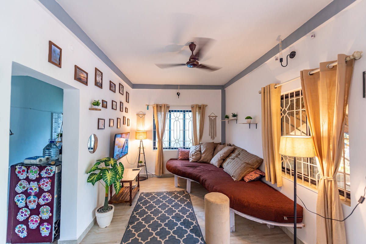Dieses zweite Zuhause ist eine gut ausgestattete Studiowohnung für Paare. Die Unterkunft ist perfekt für Touristen, die nach kurzen Aufenthalten suchen, sowie für Menschen, die von zu Hause aus arbeiten möchten. Die Wohnung verfügt über eine 24X7-Generatorstromversorgung und Highspeed-100-MBPS-WLAN. Die Lage ist zentral an der touristischen Küste von Nord-Goa und alle Strände sind innerhalb von 10-20 Minuten Fahrt leicht erreichbar. Genieße ein stilvolles Erlebnis in dieser zentral gelegenen Unterkunft.