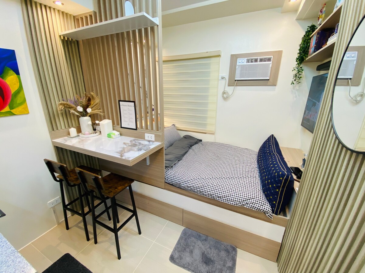 Luftige End-Einheit mit Fenstern an 3 Seiten. Separates Schlafzimmer, Wohnzimmer und Küche. Voll klimatisiert mit individuellen Temperaturreglern für das Schlafzimmer und das Wohnzimmer. In der Gartenvilla-Anlage inmitten eines üppigen Gartens, der den Pool- und Annehmlichkeitsbereich umgibt. Hauptlobby über Aufzüge, die nur die Lobby, den Parkplatz und die Garten-Villa-Etage bedienen. Überdachte Skybridge (2. Stock) zur Gateway Mall, LRT2- und MRT3-Linien. Flughafen-Shuttle-Terminal und fast alles andere, was du brauchst, ist nur ein paar Schritte entfernt.