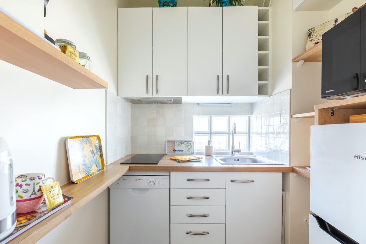 Overlooking our stunning inner courtyard and the charming neighboring church, your pied-à-terre offers open views, incredible natural light, and absolute tranquility—right in the heart of Paris. Each apartment includes a living room with a sofa bed, a dining area with a round table, a beautiful bedroom featuring a luxury hotel–quality bed, a fully equipped open kitchen with a dishwasher and washer-dryer, a shower room, and a separate toilet.