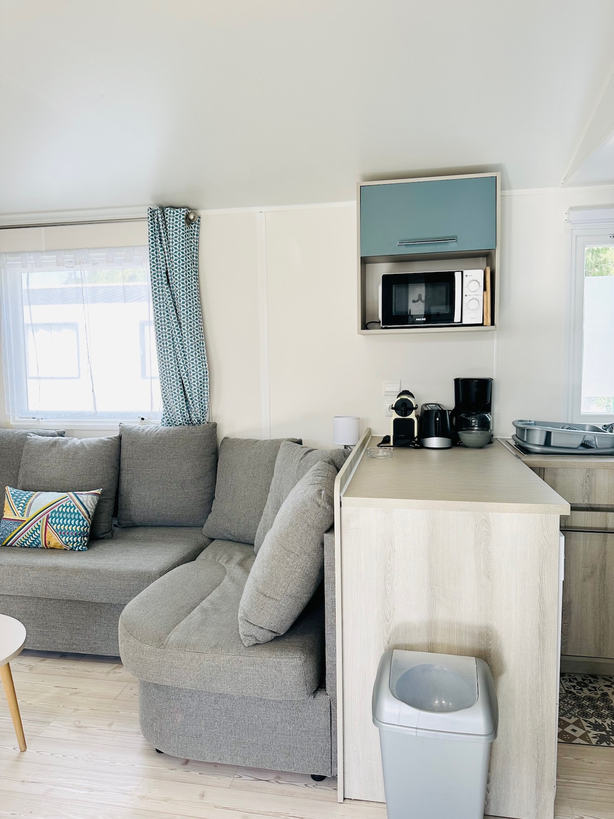 MOBILHOME 6 places 40 m² avec climatisation réversible, grande terrasse extérieure clôturée avec 1 portillon sécurisé , salon de jardin, 2 transats. Vaste salon avec télé orientable, 1 canapé convertible 2 places, 2 grandes chambres dont 1 parentale, literie haut de gamme avec grand dressing et TV Cuisine équipée, vaisselle, four, micro-ondes, plaque de cuisson, frigo avec congélateur , grille pain, bouilloire, cafetière filtres et TASSIMO dosettes, lave-vaisselle, machine à laver et étendage.