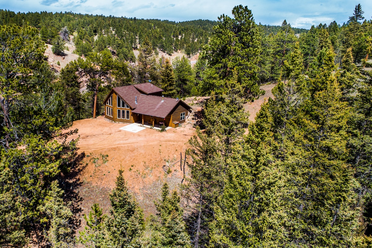 Berghütte auf 30 privaten, von Bäumen gesäumten Hektar. Offenes Konzept mit riesigen Fenstern in einem tollen Raum, um die Aussicht zu genießen! Komfortable Einrichtung mit Lodge-Thema. Bodentiefer Steingas-Kamin zum Gemütlichmachen. Große offene Küche/Essbereich, um deine Mahlzeiten zu kochen. 3-stufige Terrasse mit Whirlpool, Gasgrill und Außenmöbeln, um dein Outdoor-Erlebnis zu maximieren.