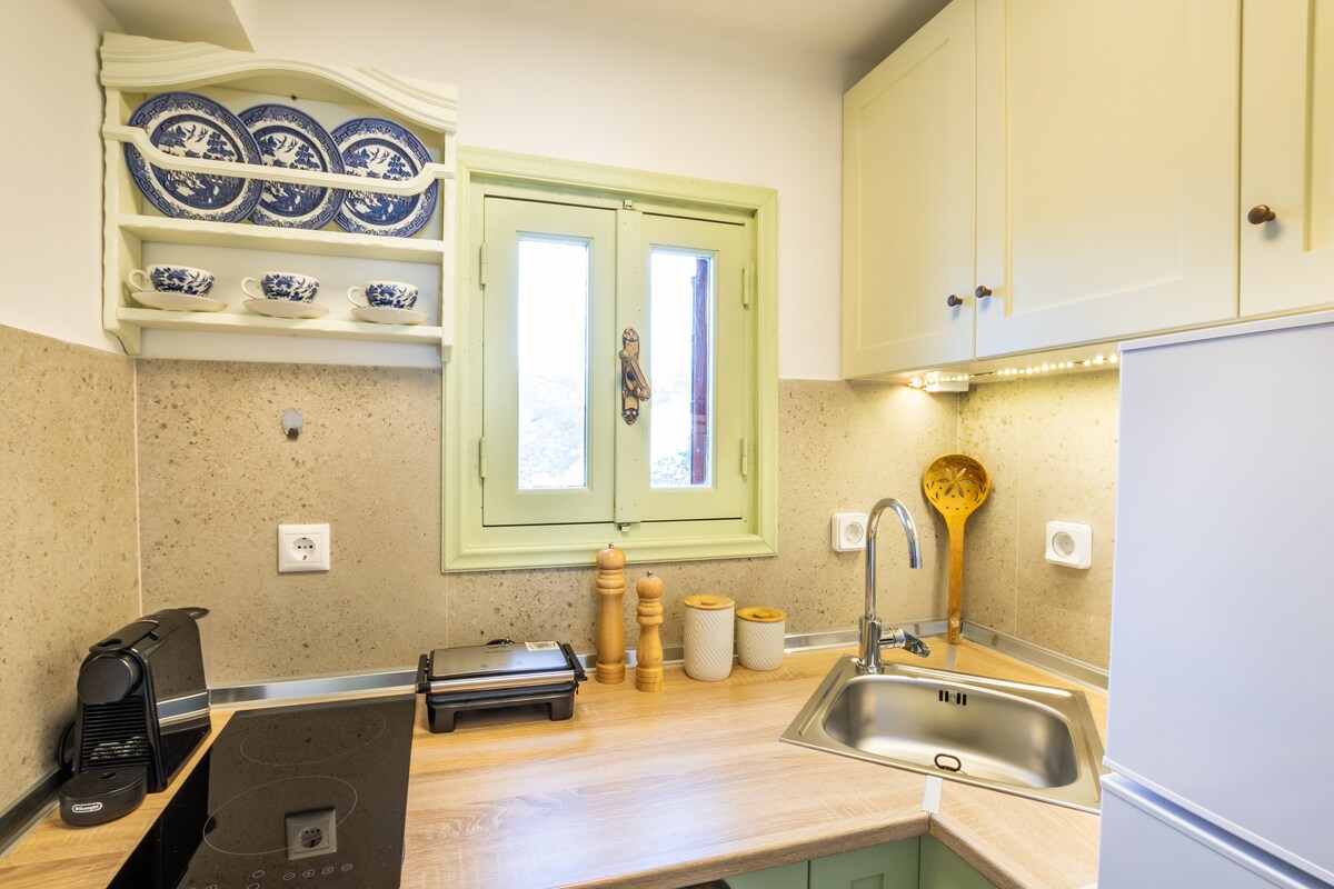 Irene's Cottage Myrtonas ist ein ruhiger Rückzugsort auf einem Hügel, perfekt für Paare. Nur 15 Minuten vom Strand Kyra Panagia entfernt, bietet es Meerblick, eine große private Terrasse mit Grill, eine voll ausgestattete Küche, einen gemütlichen Ess-/Wohnbereich und ein traditionelles Karpathiko-Hochbett mit Stauraum. Mit Klimaanlage, WLAN und Waschmaschine verbindet es Komfort, Charme und authentischen Karpaten-Stil für einen romantischen und erholsamen Urlaub.