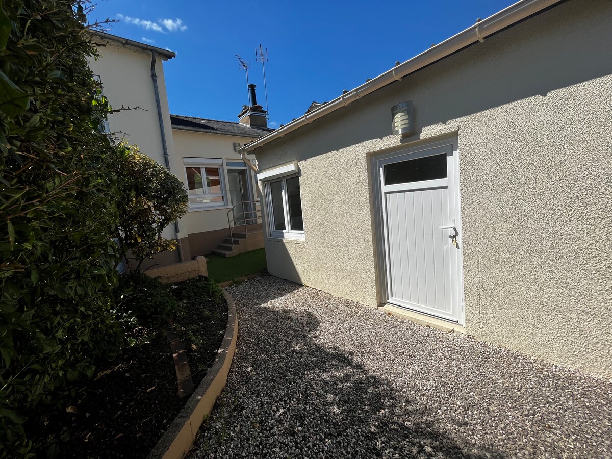Studio pour 2 personnes avec tout le confort. Il se situe au bout du jardin de ma propriété et donne sur un chemin piéton calme. Vous pourrez profiter d'une petite cour ensoleillée. Le stationnement est gratuit dans la rue. Vous êtes à 15 min à pied de l'entrée du circuit des 24h et 7 min à pied du parc des expositions du mans. Pour les motos, la réservation est de 3 nuits min du jeudi au dimanche. Pour les 24h Auto et "Le Mans Classic", 4 nuits min du mercredi au dimanche.