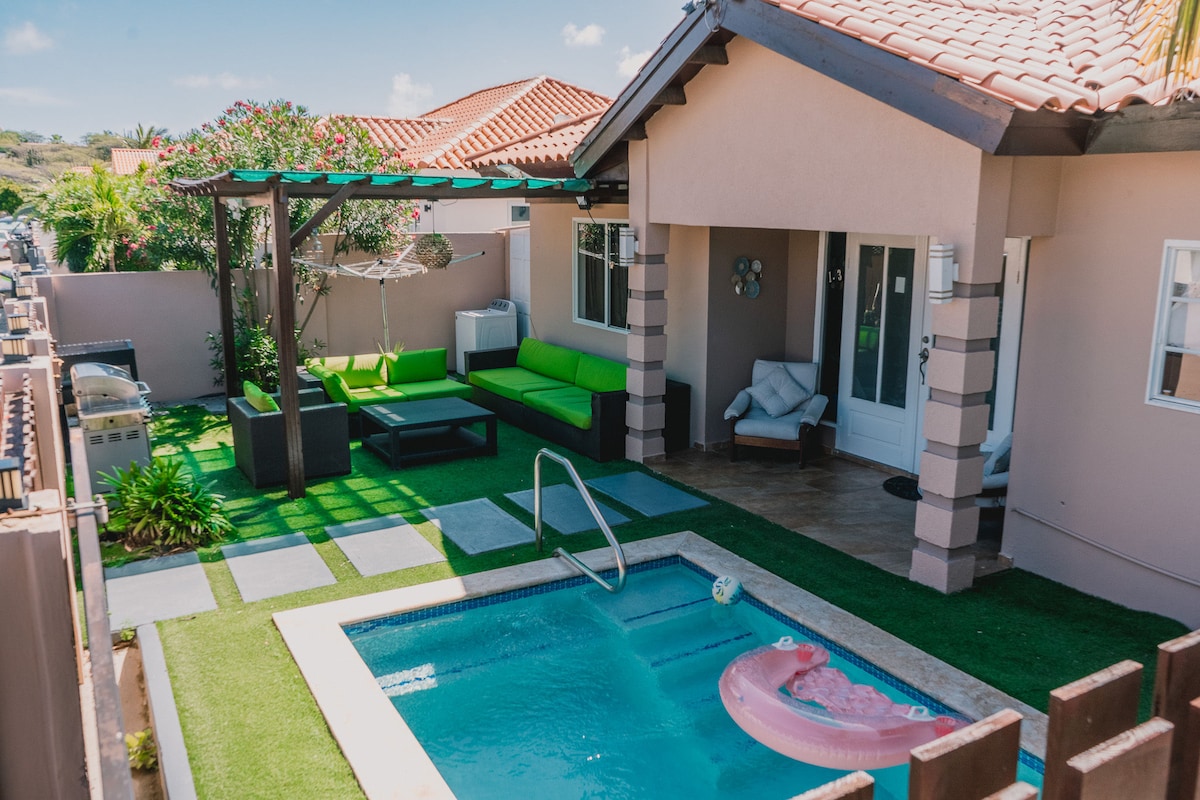 Erlebe Aruba in diesem gemütlichen Haus mit einem extra großen privaten Pool in einem tropischen Garten. Der geräumige Poolbereich verfügt über eine Terrasse mit bequemen Liegestühlen, eine Außenterrasse mit einem Grill. Genieße deinen Tag am Pool oder mache einen kurzen 15-minütigen Spaziergang zum nächsten Strand. Im Inneren erwartet dich eine moderne Küche, die mit allem Notwendigen ausgestattet ist. Das gesamte Haus ist klimatisiert und die Schlafzimmer sind sowohl modern als auch geräumig. Schaffe bleibende Erinnerungen mit Freunden und Familie in diesem perfekten Ferienhaus.