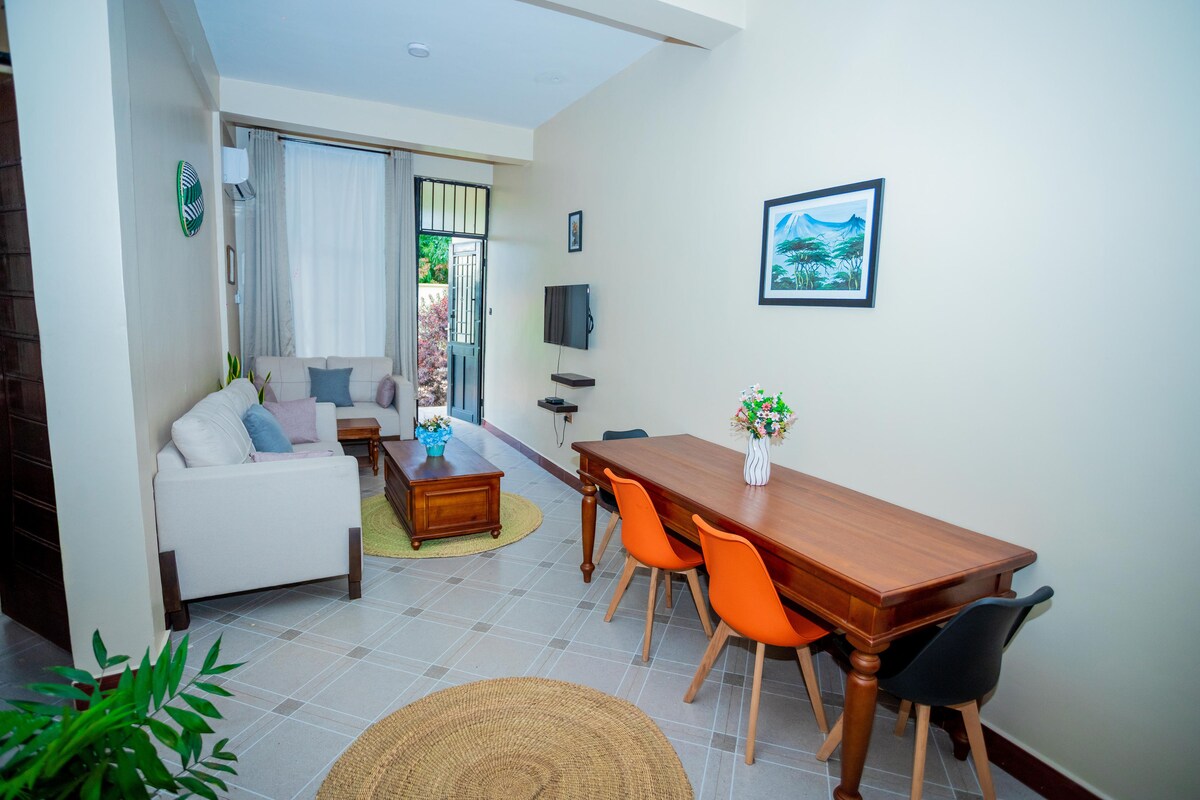 Kinga Home Suites besteht aus 5 voll möblierten Suiten mit WLAN, 4 Suiten mit zwei Schlafzimmern mit Wohnzimmer, voll ausgestatteter Küche und Terrasse, 1 Suite mit einem Schlafzimmer mit Wohnzimmer, voll ausgestatteter Küche und Terrasse. Jede Suite mit zwei Schlafzimmern verfügt über zweieinhalb Badezimmer und ein Schlafzimmer über ein Badezimmer. Unsere öffentlichen Bereiche bestehen aus einer Lounge, einem Garten, einem Essbereich und einer Bar.