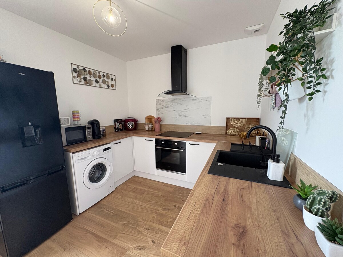 Bel appartement cosy, neuf dans une petite résidence calme. Commodités proches à pied moins de 3min : boulangerie/pâtisserie, boucherie, restaurant, épicerie, tabac. Arrêt de bus à proximités. Lac de Cadarsac à 3km. 1 chambre avec un lit double, cuisine équipée avec cafetière, télévision connectée avec Netflix, wifi. 2 places de parking privé. Balcon extérieur. 1er étage sans ascenseur