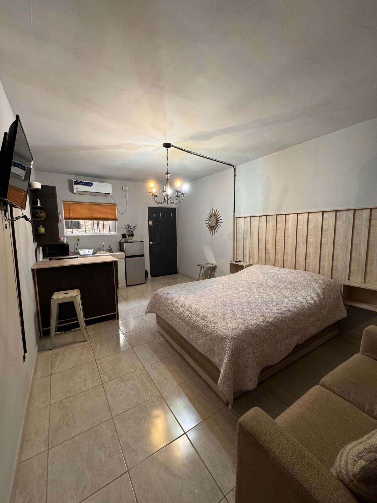 Apartamento de una recámara ubicado a 10 minutos en carro del Consulado Americano, en la zona de Bachilleres 5. Cuenta con cama cómoda, baño equipado con toallas, jabón, shampoo y acondicionador. Cocineta con estufa eléctrica portátil, microondas, mini refrigerador, utensilios, platos, vasos y condimentos básicos. Además, dispone de mini split para mayor confort. Nos puedes encontrar en Google Maps como Estancias Nava.