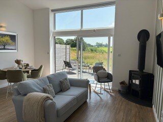 The Old Tractor Shed is a modern barn conversion, ideal for couples. Floor-to-ceiling windows and doors open to a private decking area with your own hot tub, all overlooking stunning views. Inside, relax with a luxurious super-king bed, log burner, Smart TVs and a fully equipped kitchen. The bathroom features a roll-top bath and a large, powerful waterfall shower. Accredited with Exmoor National Park’s Dark Skies, it’s the perfect place for stargazing.