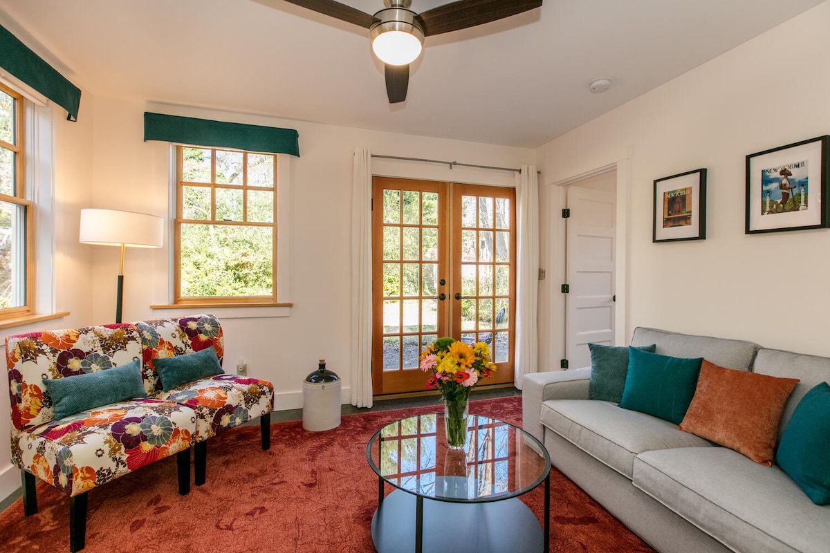 Willkommen! Antiquitäten + International + Funky AVL + Kunst + Komfort + Lokale Tipps = Dein Ort, um Asheville vom historischen Montford in einem 120 Jahre alten Haus zu erkunden. Privat, sonnig, 650 Quadratfuß groß. Entspanne dich und erlebe das lokale Leben. Nur wenige Gehminuten von der Innenstadt, dem botanischen Garten und dem Greenway entfernt. Voller Charme. Parkplätze abseits der Straße und private Terrasse. Genieße einen Drink, eine Mahlzeit oder ein gutes Buch drinnen oder draußen. Entspanne, spiele, arbeite oder plane dein nächstes Abenteuer. Feiere etwas Besonderes. Erhole dich gut.