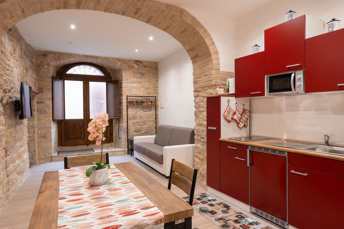 Appartamento situato entro le mura storiche della città, a 50 m dalla Cattedrale di San Rufino e dal capolinea del bus cittadino che permette di raggiungere facilmente la stazione ferroviaria di Santa Maria degli Angeli. L' appartamento, completamente autonomo, è ricavato all'interno di una struttura più grande e si articola su due livelli: superiormente un soggiorno ampio, un ballatoio usufruibile come camera, un bagno; al piano inferiore la cucina con annessa lavanderia e un ulteriore bagno.