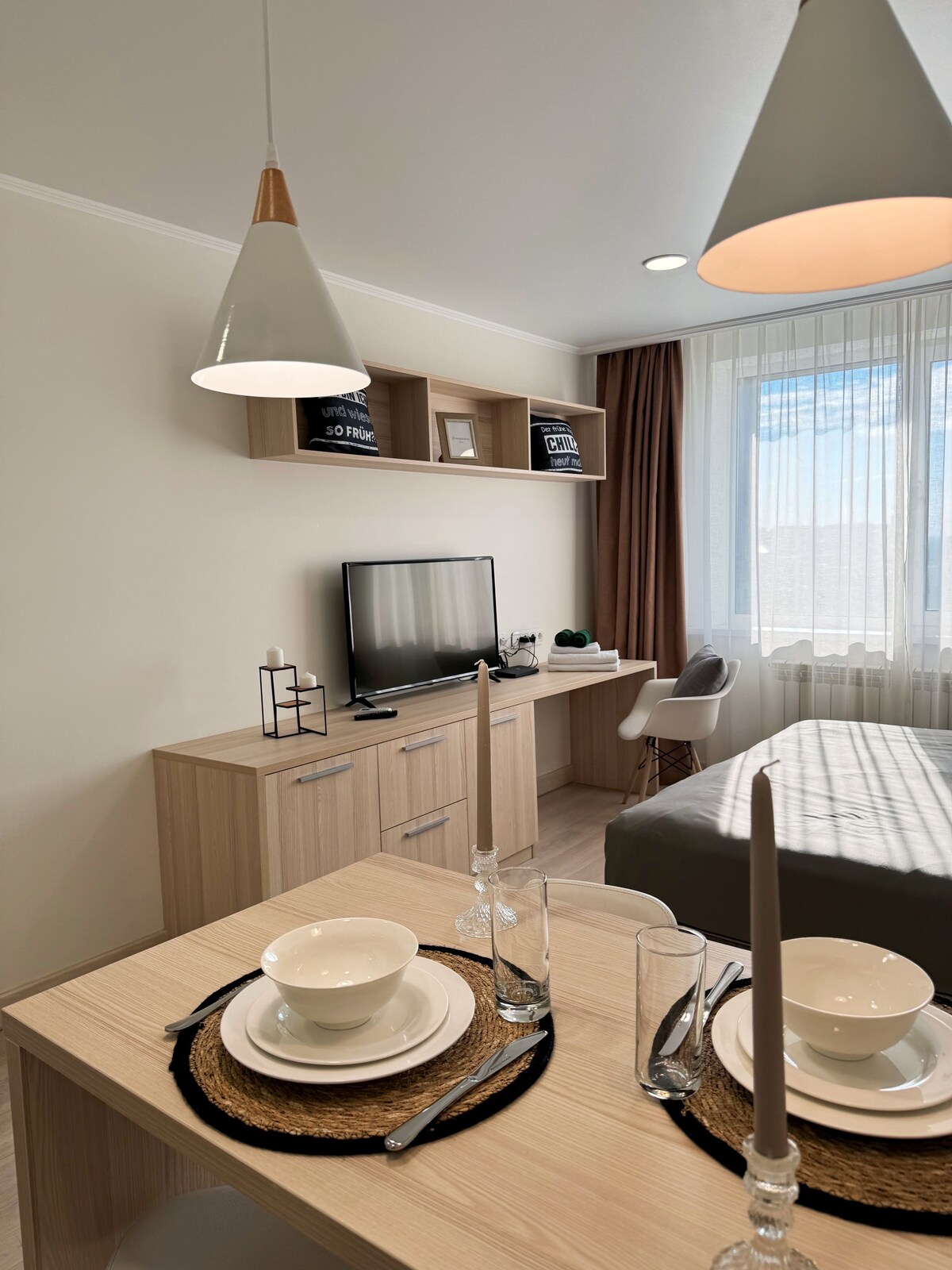 Наши апартаменты созданы для комфортного проживания гостей, которые ценят качество, простор и стиль. Что вас ждёт: • Светлые и современные номера с продуманным дизайном • Полностью оборудованная мини-кухня • Удобная кровать и качественное бельё гостиничного стандарта • Бесплатный Wi-Fi на высокой скорости • Тишина и абсолютный комфорт — подойдёт как для отдыха, так и для работы • Уборка для вашего удобства • Круглосуточная стойка ресепшн и безопасность • Локация