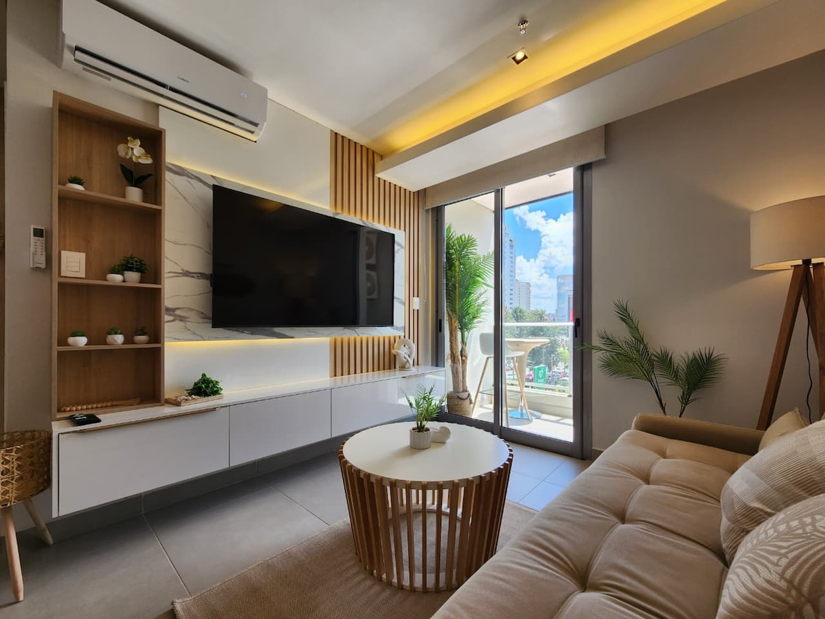 Wohnung in einem der oberen Stockwerke, mit Balkon und freiem Blick, voll ausgestattet für einen komfortablen Aufenthalt: - Kingsize-Bett mit fester, hochdichter Matratze - Arbeitsbereich mit Schreibtisch und WLAN-Verbindung - 55-Zoll-Smart-Fernseher - Dachterrasse mit Pool und Fitnessraum - Quincho - Waschen - Sicherheitsdienst rund um die Uhr Eine außergewöhnliche Lage: - Im Corporate Axis gelegen, nur 5 Minuten von Shopping del Sol und Paseo La Galería entfernt - 15 Minuten vom internationalen Flughafen Silvio Pettirossi entfernt