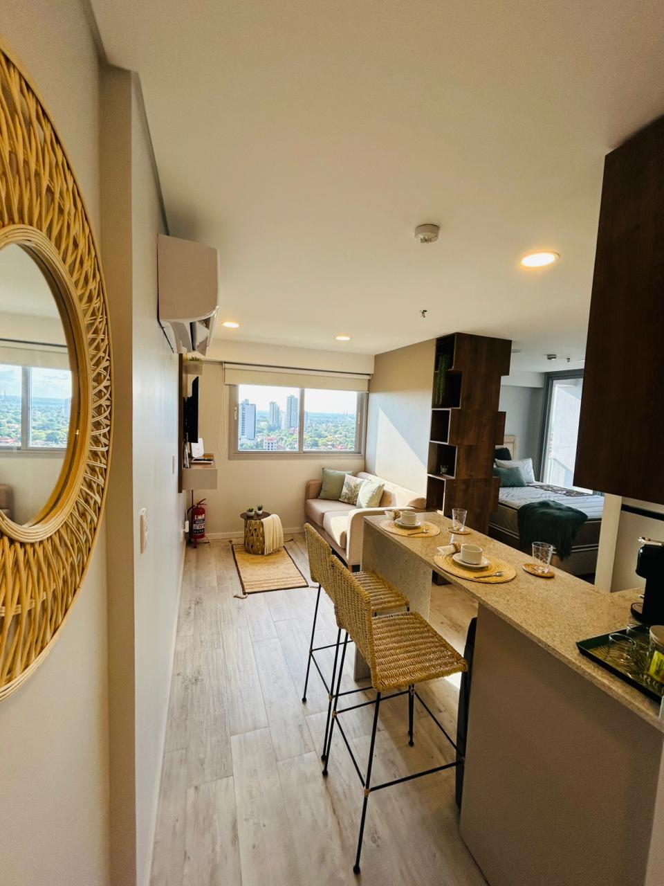 Stay in the best area of Asunción, just steps from Paseo La Galería and Shopping del Sol. This 15th-floor luxury apartment offers panoramic views, a cooled queen bed, 65" NeoQLED TV with sound system, and a fully equipped kitchen ideal for long stays. Enjoy access to spa with sauna, Jacuzzi, massage room, rooftop pool, gym, co-working, reading lounge, playroom, BBQ area, valet parking, and 24/7 security in a premium high-rise.