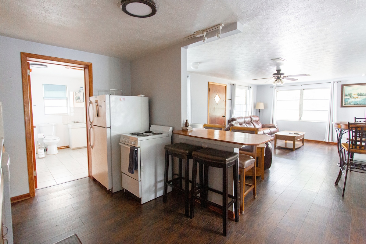 Dieser niedliche Raum ist an unser Haus angebaut und bietet dennoch absolute Privatsphäre. Es gibt ein Schlafzimmer mit einem Queensize-Bett. Der Wohnbereich verfügt über ein doppeltes Liegesofa und einen Sessel, sodass du in kühlen Nächten bequem fernsehen oder am Kamin sitzen kannst. Der Hauptwohnraum verfügt auch über einen Tisch und Stühle, um Mahlzeiten zu genießen oder als Arbeitsbereich zu nutzen. Küchenzeile mit Keurig-Kaffeemaschine, Kaffee, Mikrowelle, Toaster und Minikühlschrank. In der Wohnung befindet sich ein Kochfeld. Tolle Lage nur 6 Blocks vom Strand entfernt. 1