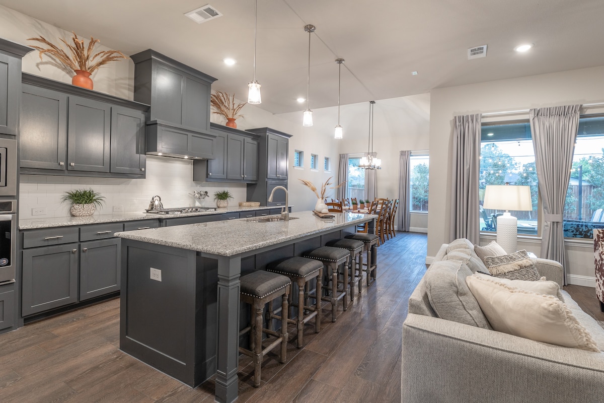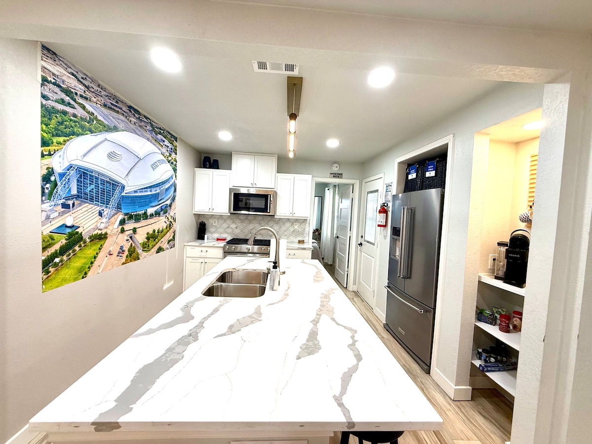 Was du ❤️ über deinen Aufenthalt wissen solltest: - Zentral im Herzen von Arlington gelegen - Nur wenige Minuten vom AT&T-Stadion, Texas LIVE, Globe Life Field, Six Flags, Hurricane Harbor, University of Texas in Arlington, Billy Bob's of TX, Famous Stockyards of Fort Worth und DFW Airport entfernt - 19 Minuten Fußweg zum AT&T-Stadion - Nur wenige Gehminuten von Geschäften, Restaurants und Bars entfernt - Feuerstelle/Grill/Essen im Freien - voll ausgestattete Küche (Kapseln/Kaffee vorhanden) - High-Speed-Internet - (3) Smart-TVs - Waschmaschine und Trockner in voller Größe