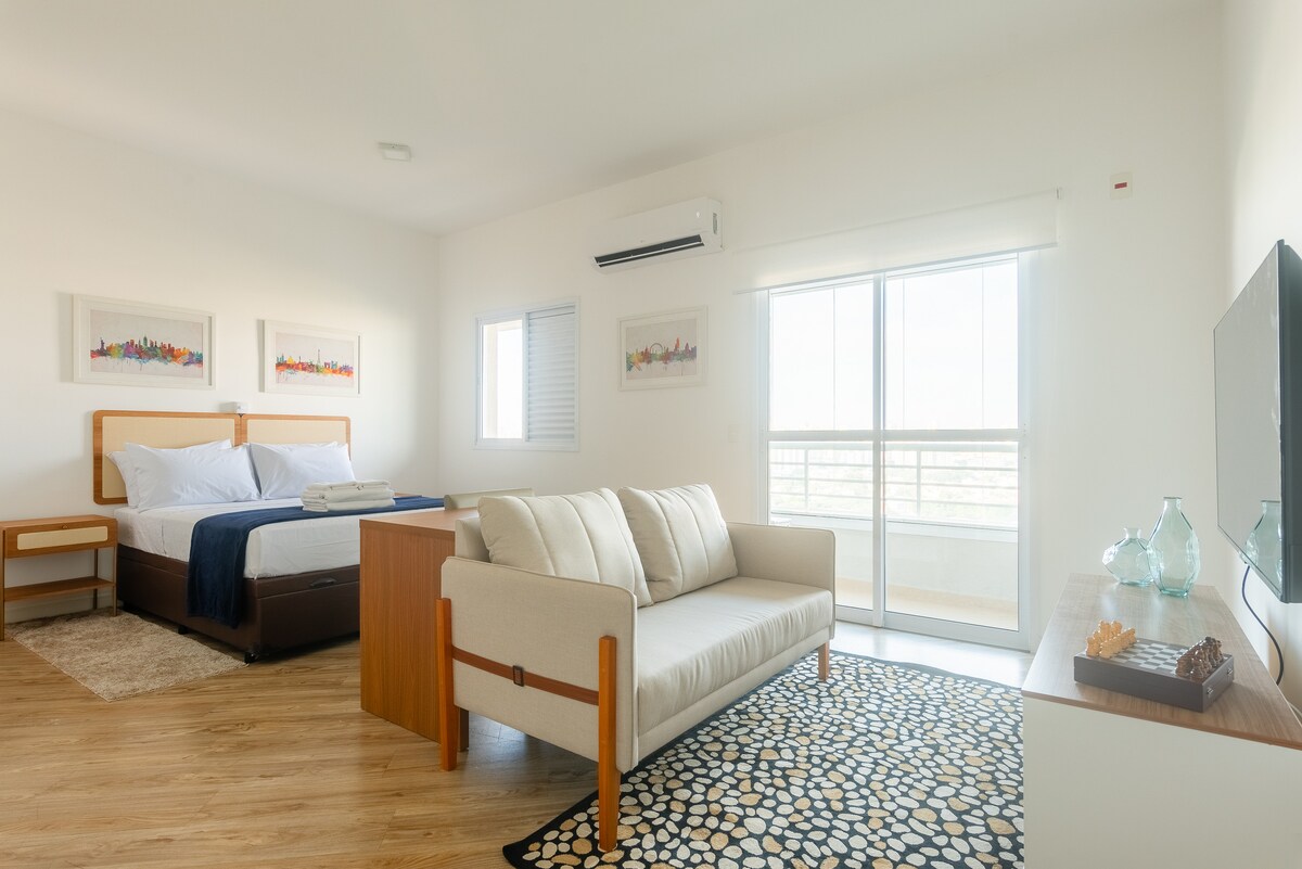 Modernes und gut eingerichtetes Studio in der besten Region von São Bernardo do Campo com Ar Condicionado. Eigenständiger Check-in mit elektronischem Schloss. Es hat ein Doppelbett und ein Schlafsofa. Geschlossener Balkon mit Tageslichteingang tagsüber und schafft nachts eine gemütliche Atmosphäre. Ideal für die Arbeit mit einem Bürostuhl. Smart-TV mit Netflix, Amazon Prime und YouTube. 700 Mbit/s Glasfaser-Internet, sehr schnell, ideal zum Ansehen von Filmen und Arbeiten.