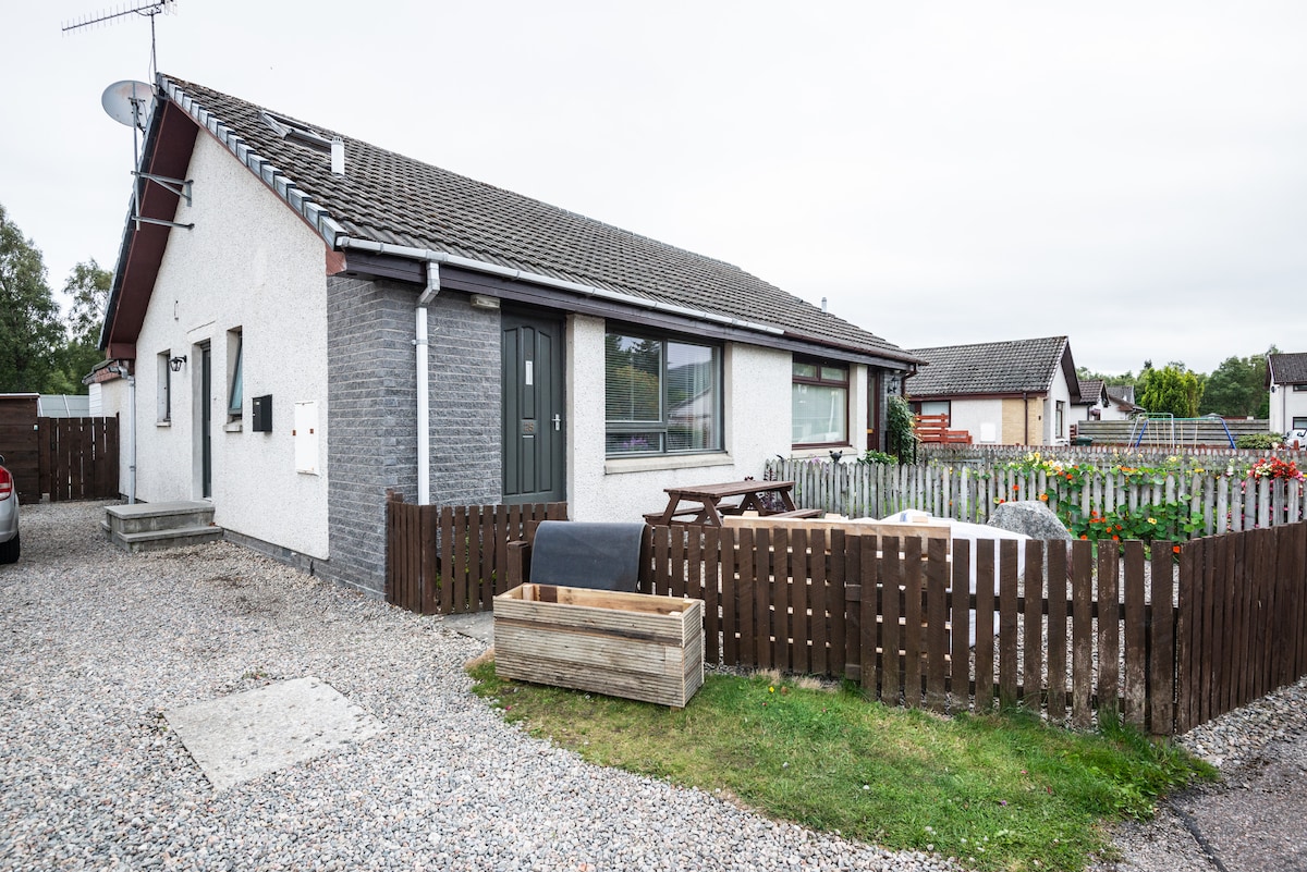 Ein Bungalow mit zwei Betten, Schlafplätze für 4 Personen, ein willkommenes zweites Zuhause. Das Hotel liegt in der schönen Stadt Aviemore im Herzen des Cairngorms-Nationalparks. Die Unterkunft verfügt über einen geschlossenen privaten Garten und eine gemeinsame Einfahrt für 2 Autos. Die Stadt Aviemore und die Geschäfte sind einen 10-minütigen Spaziergang entlang einer schönen ruhigen Gasse entfernt, die von Blick auf die Berge und die Strathspey Steam Railway gesäumt ist. Die Eisenbahn verläuft in der Nähe des unteren Randes des Gartens und ist perfekt für Kinder (und Erwachsene!), um dem Fahrer zuzuwinken. Ein Hund ist willkommen.