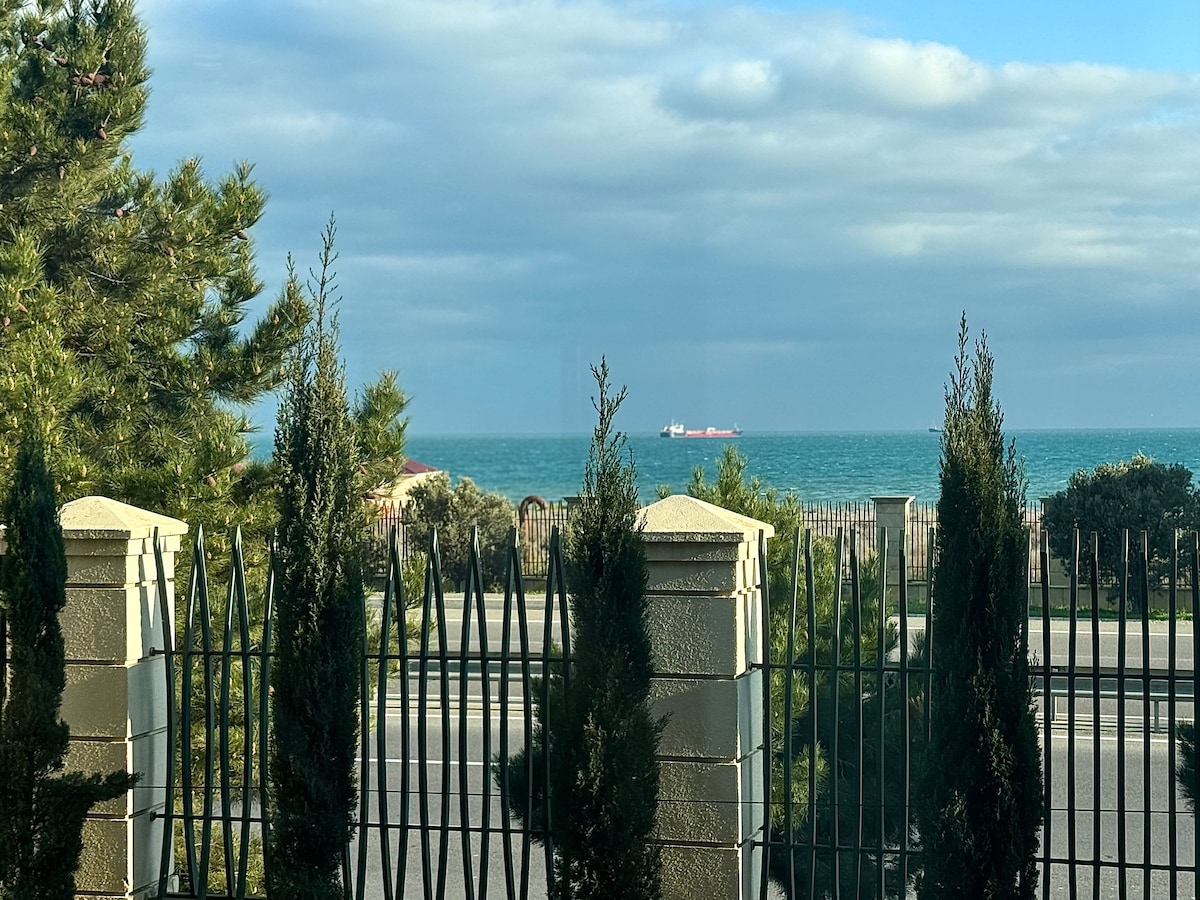 Luxury new villa in a great location, very close to the beach, restaurants, cafes & beach clubs. Located on the main road, 24/7 supermarket & EV charging port across. Panoramic Caspian Sea view. Family-friendly, quiet & clean. Parking for 2 cars. Enjoy outdoor games (dart, frisbee, badminton), indoor games (TV, board games). Fully equipped kitchen & BBQ. Welcome treats: coffee, oranges, charcoal, wine. Next Beauty Salon, our wall-neighbour, offers ladies-only hammam, sauna, gym, beauty services.