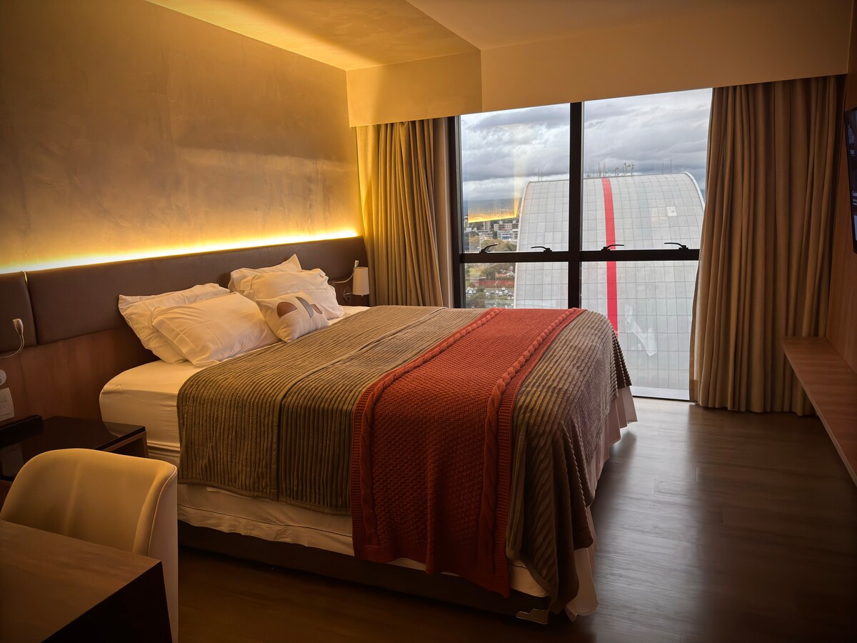 At the Cullinan Hplus Premium hotel. Very new and contemporary. Amazing location! Two malls across the street. Great tourist spots to go on foot. Charming, finely decorated and furnished unit. On the highest floor, with a beautiful view of Brasília and Asa Norte. 29m² luxury suite with king bed. Well equipped with several items for your convenience. Acoustic insulation on the windows for a great rest. Smart TV. Garage. Swimming pool, gym, sauna and restaurant. Check in 24 hours at reception.