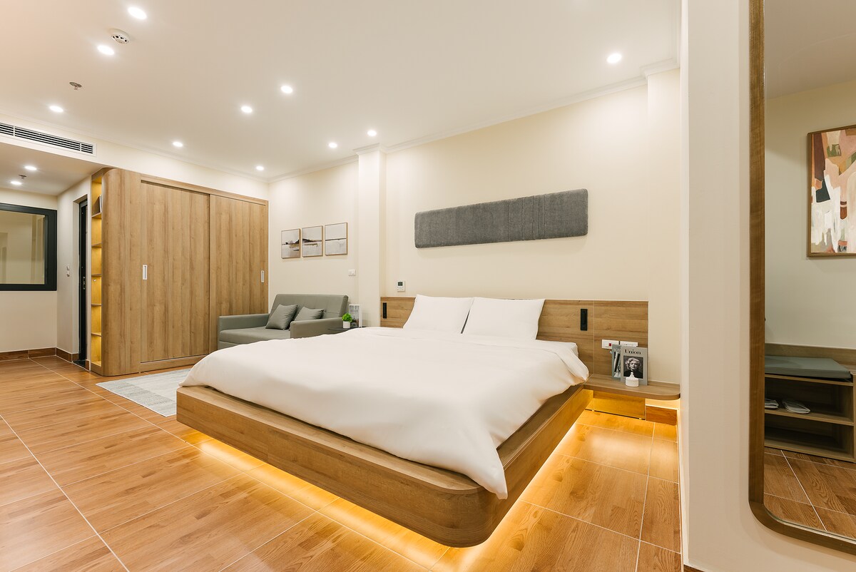 Ein gemütliches Studio mit Naturholzdesign und einem privaten Balkon im Freien mit viel Grün. Es befindet sich im vierten Stock eines Gebäudes in einem sicheren und ruhigen Viertel in der Nähe des Trúc Bạch-Sees. Perfekt für Alleinreisende oder Paare, die einen ruhigen Rückzugsort suchen. Frau Nghĩa steht dir direkt im Gebäude zur Verfügung, um dir täglich von 9:00 Uhr bis 16:30 Uhr persönlich zu helfen.