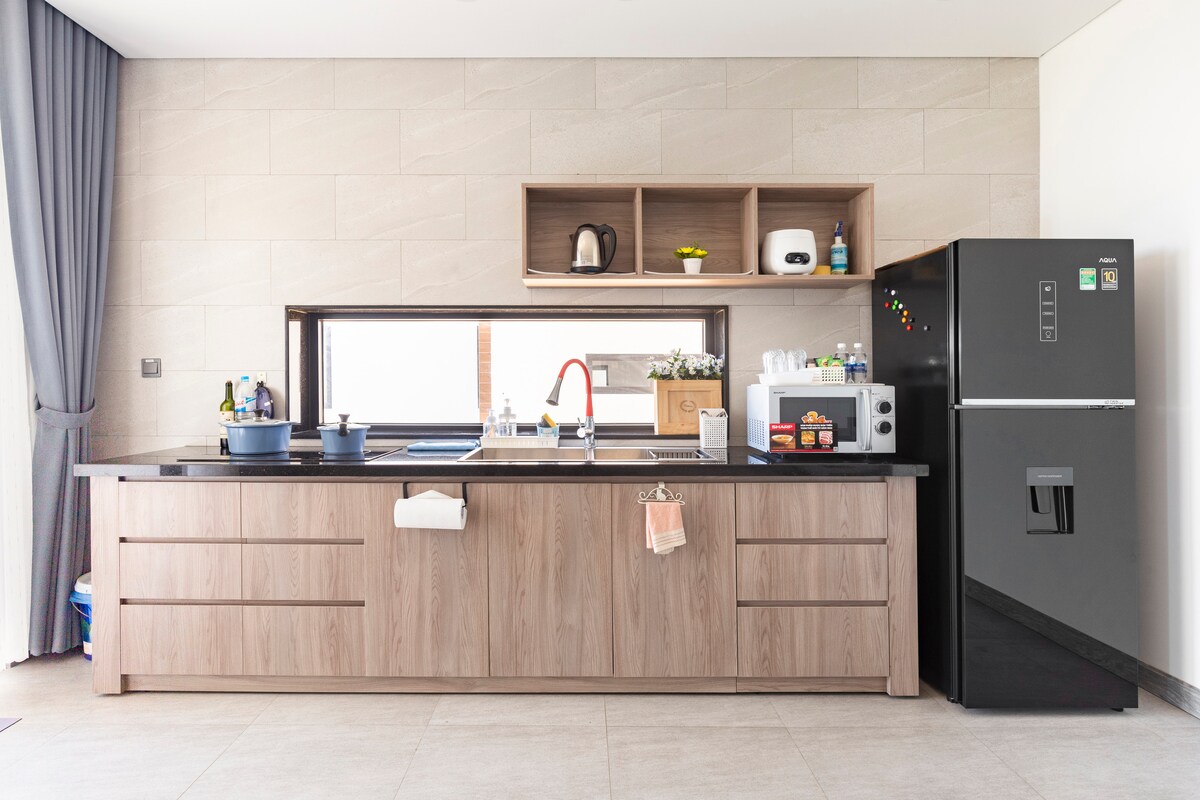 Căn hộ và biệt thự nghỉ dưỡng Aria sang trọng sát biển Phòng góc 3 hướng rộng, thoáng mát 156m^2 2 phòng ngủ, mỗi phòng ngủ có 1 giường (1m8 và 1m6), ngoài ra còn có thêm 2 nệm xếp khi cần. Căn hộ có wifi, tivi, máy lạnh, máy giặt và bếp (có sẵn nồi niêu xoong chảo, lò nướng và cả gia vị để phục vụ cho tiệc gia đình). Có tài khoản Netflix để xem phim. 3 phòng tắm giúp giải quyết mọi nhu cầu sau khi tắm biển cho cả gia đình. Có phụ thu phí khi vượt quá số lượng khách quy định (không extra bed)