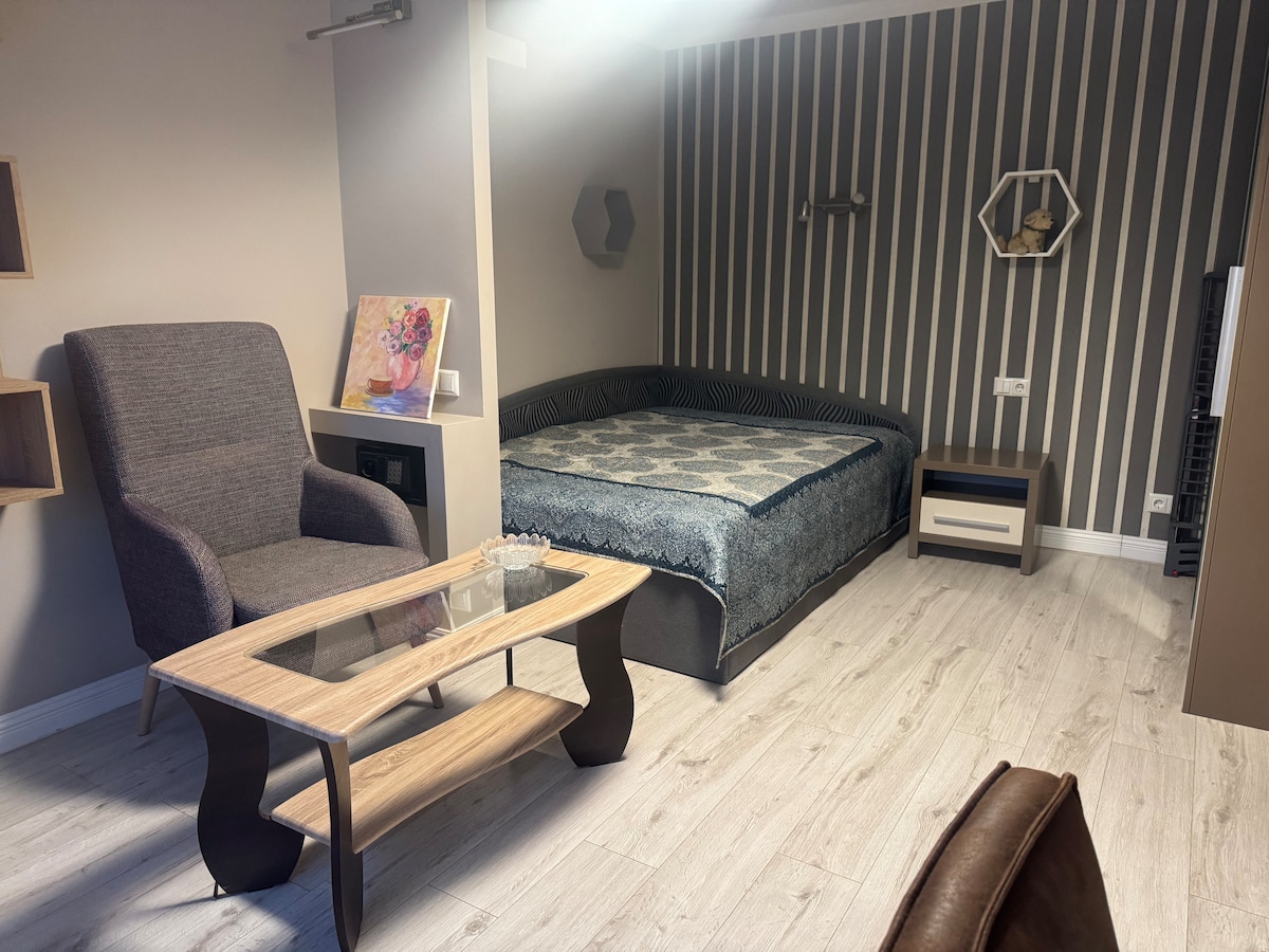 This apartment is ideally located in the historic centre of Riga, with views of the Old Town. It is close to restaurants, shops and all the main tourist attractions, making it easy to plan your visit. The cozy studio has a unique oval office and coffee machine for undisturbed work. The bedroom include a king-size bed and a TV corner for relaxation. Freshly renovated bathroom with washing machine and toiletry amenities are also available.