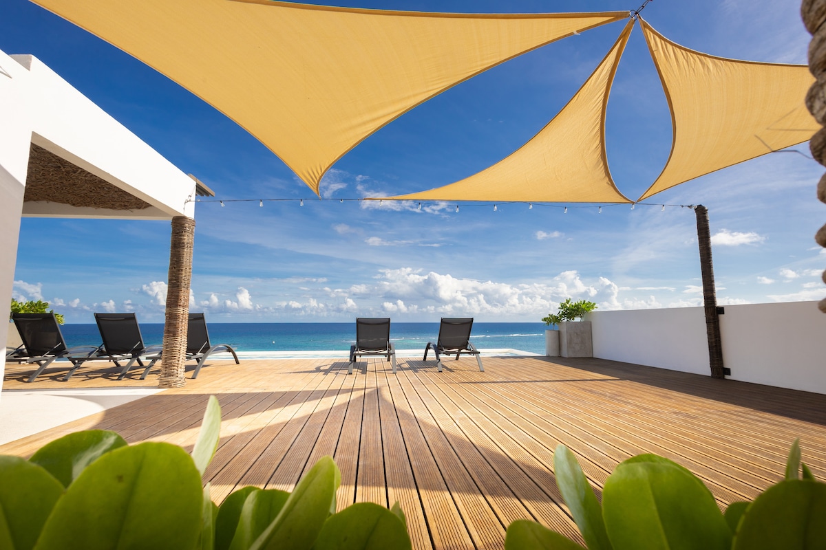 Villa Ek Nah is an incredible beachfront penthouse in Mahahual. Privileged location: Villa Ek Nah is located right in front of the sea, which means that you will be able to wake up with spectacular views and enjoy the sea breeze throughout the day. Access to exclusive facilities: As a guest of our penthouse, in addition to having access to the complex's facilities and direct access to the ocean, you will also have access to the private roof top with Jacuzzi, palapa and barbecue.
