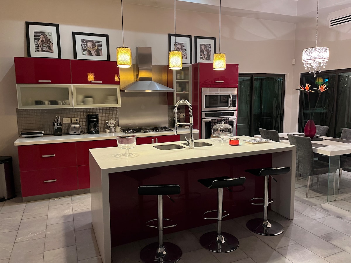 Ein stilvolles Haus mit geräumigem Wohnzimmer, Queensize-Hauptschlafzimmer mit eigenem Bad, Kleiderschrank, TV und Schreibtisch. Ein zweites Schlafzimmer im offenen Raum mit Queensize-Betten, Kleiderschrank, TV und Schreibtisch. Ein zusätzliches 2 komplettes Badezimmer für Besucher, Eingangshalle, ausgestattete Küche, mit Gasherd, Entspannen in einem Gemeinschaftsgarten mit Grill, bereit für einen Bratenbraten unter dem Überbleibsel von spektakulärem Bambus auf einem Gartentisch. Kommt zu Fuß einen Block zur IMSS