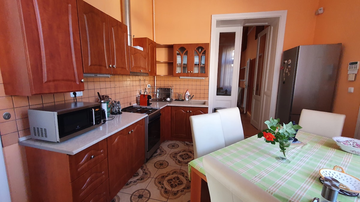 Die neu renovierte Wohnung befindet sich in einem über 100 Jahre alten Gebäude in der Innenstadt von Szeged, 500 m vom Domplatz entfernt. Es gibt nur 5 Stufen und du erreichst die Wohnung, die hell, ruhig und perfekt zum Entspannen ist. Auf der anderen Straßenseite findest du einen Coffeeshop und ein kleines Restaurant mit Pizza und Hamburgern. Krankenhausgebäude befinden sich in der Nähe. Du kannst auf der Straße parken oder du kannst einen privaten Parkplatz für 1 Auto in einem geschlossenen Innenhof für 1000 Ft (3 EUR) pro Nacht wählen.