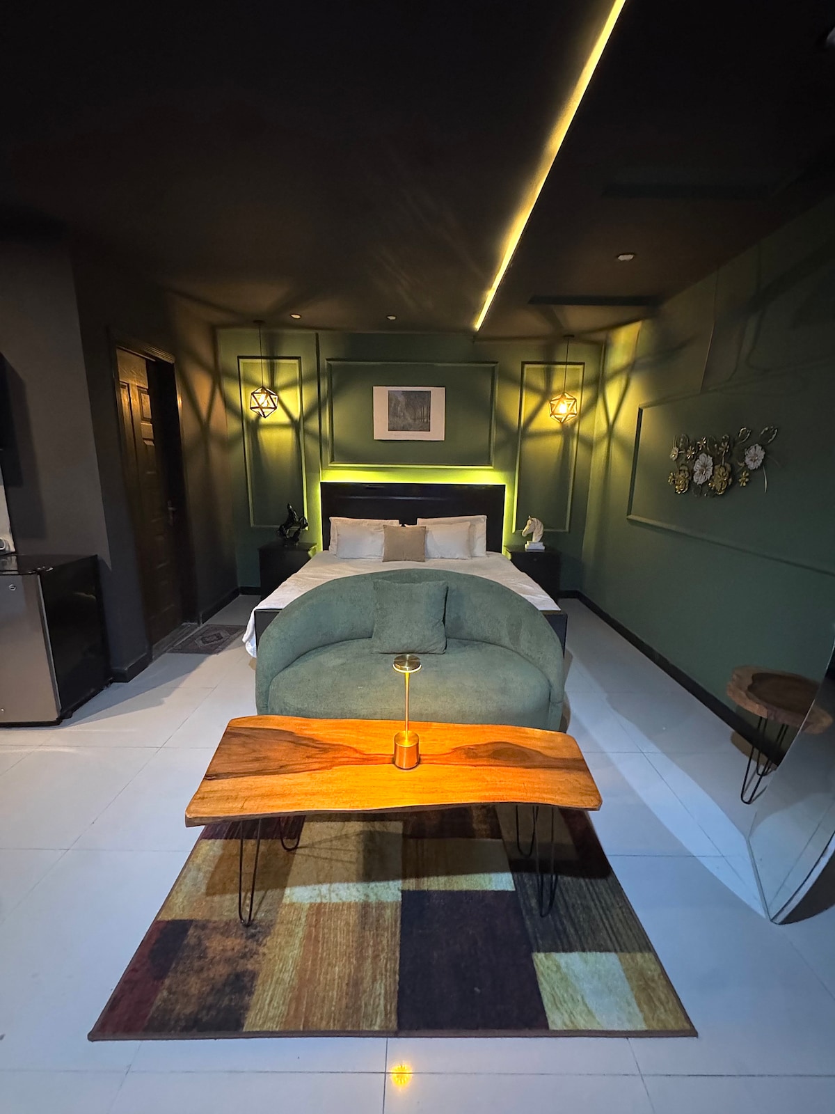 Tritt ein in Moonlight Noir - ein eleganter, schwarzer Rückzugsort mit 2 Schlafzimmern, der mit Mondlichtatmosphäre leuchtet. Genieße eine schicke Lounge, eine erstklassige Küche und gemütliche Schlafzimmer, die auf Stil und Komfort ausgelegt sind. Zugang zu erstklassigen Annehmlichkeiten wie einem Pool, einem Fitnessstudio und sicheren Parkplätzen. Perfekt für Geschäfts- oder Urlaubsaufenthalte in Lahore. Erlebe Luxus, Ambiente und Ruhe — alles unter einem Dach - in diesem einzigartigen und ruhigen Kurzurlaub.