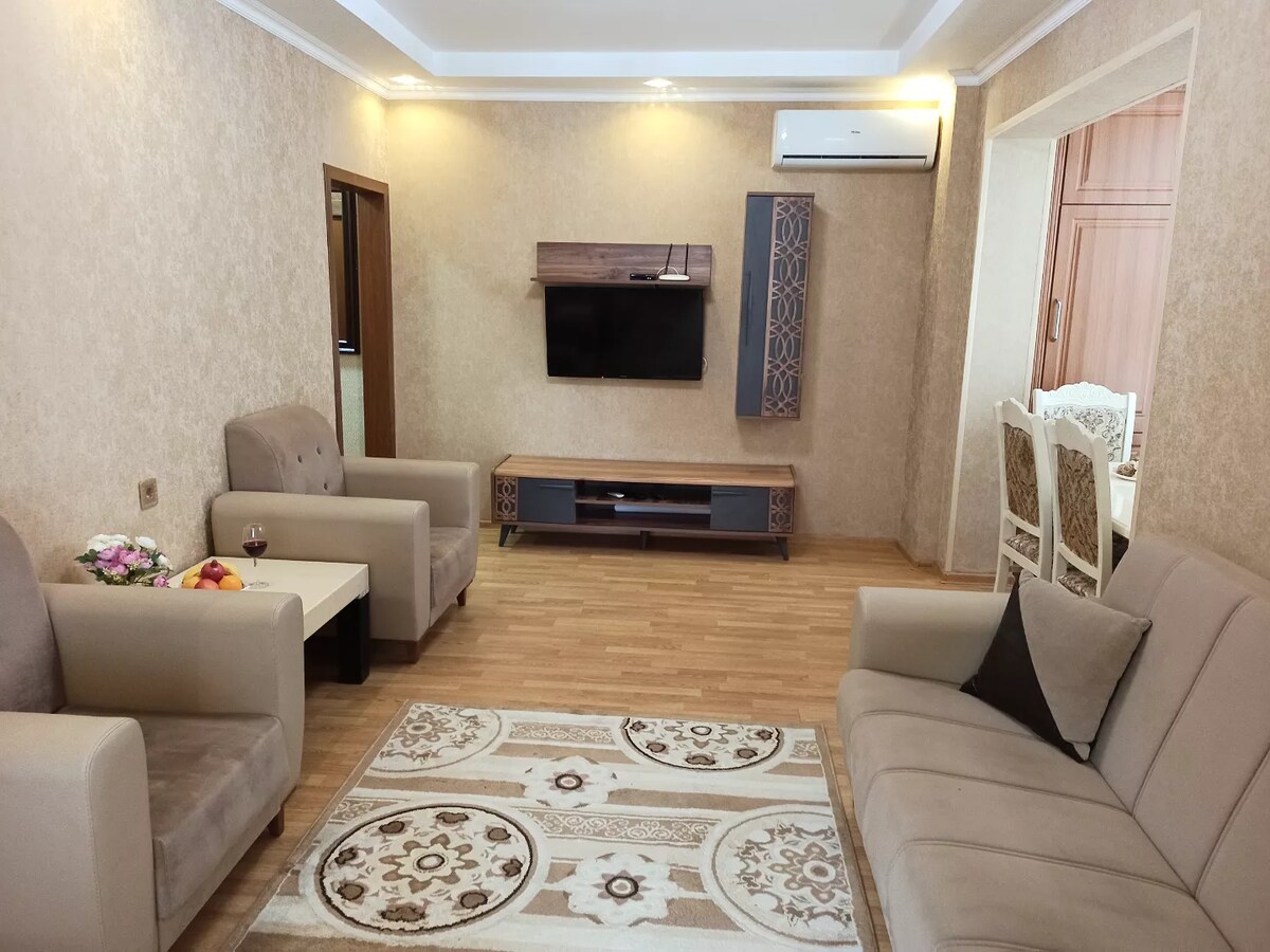 Helle und gemütliche 3-Zimmer-Wohnung (100 m²) im Zentrum von Baku, im 1. Stock. In der Nähe der Altstadt, Parks, Cafés und Geschäfte. Grüner Innenhof mit Bäumen und einem Spielplatz. Mit Schlafzimmer, Kinderzimmer, Wohnzimmer, Küche mit gefiltertem Wasser, WLAN, Klimaanlage und Waschmaschine. Kontaktloser Selbst-Check-in. Perfekt für Familien und längere Aufenthalte. Sauber, komfortabel und voll ausgestattet.