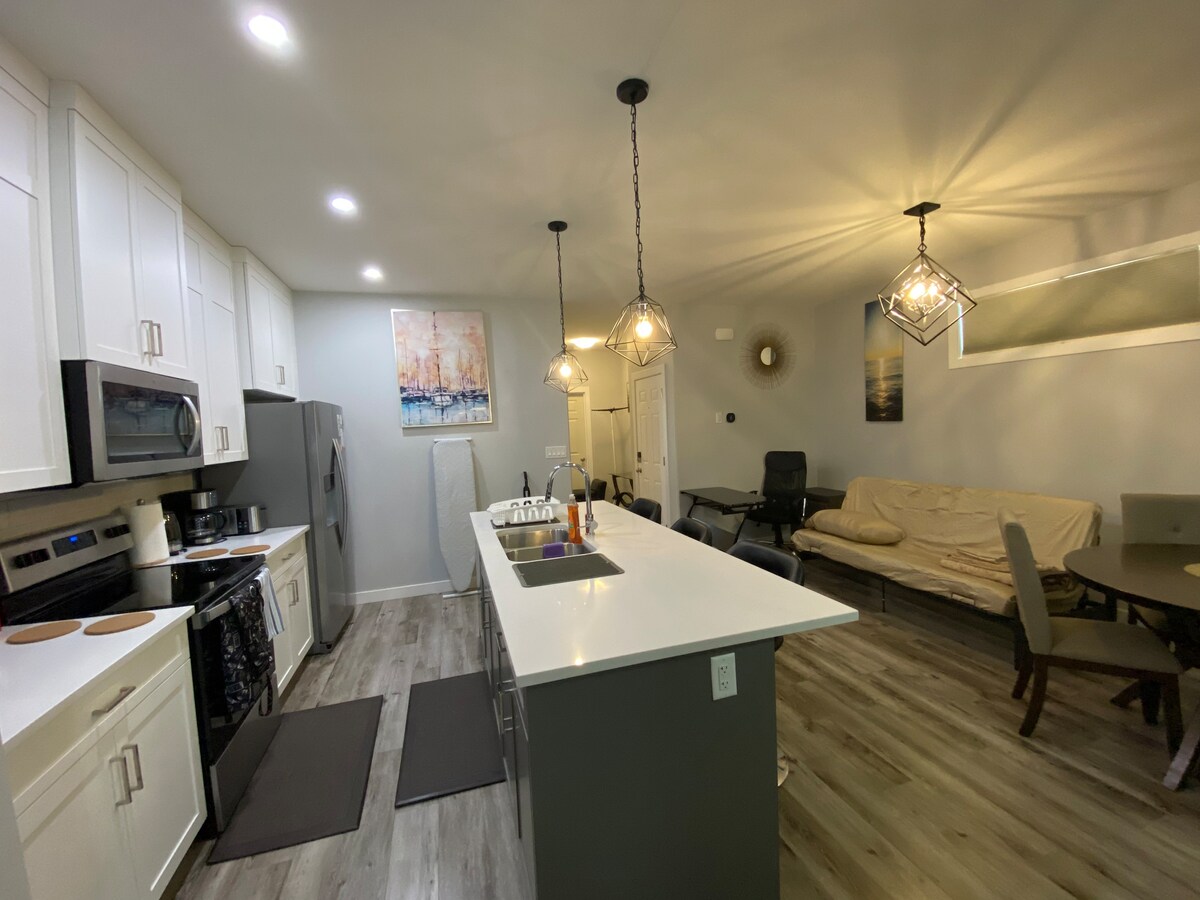 Eine neu gebaute Kellersuite. Gemütlich, ruhig und ein Ort, an dem du dich wie zuhause fühlst. Sie verfügt über einen Wohnbereich, in dem du dich entspannen und Programme deiner Wahl ansehen kannst, eine Küche, in der du schnelle Mahlzeiten zubereiten kannst, ein komfortables Schlafzimmer mit einem Queensize-Bett für zwei Personen und ein Badezimmer in voller Größe. Faltbarer Arbeitsplatz für den Fall, dass du an deinem Laptop arbeiten musst. Du hast auch einen schönen Hinterhofbereich, in dem du dich wie zu Hause entspannen kannst.