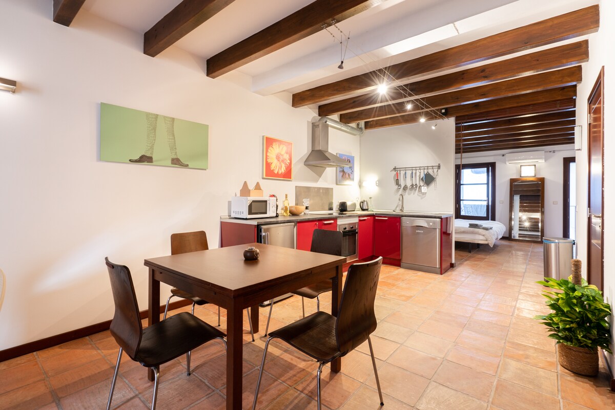Charmantes und komfortables Design-Obergeschoss ideal für Paare, komplett renoviert und ideal gelegen mitten im Herzen der Altstadt. Nur 5 Gehminuten vom Hauptbahnhof der Insel entfernt. Es gibt 2 weitere Einheiten im selben Gebäude, die alle zu Poc a Poc Suites turismo interior gehören. Komplett ausgestattet: leistungsstarke und leise Klimaanlage, Heizung, WLAN, TV-DVD, Waschmaschine mit Trockner, Geschirrspüler, Backofen, Mikrowelle, Kaffeemaschine, Wasserkocher, Kochutensilien, Haartrockner, Bügeleisen + Bügelbrett ... alles, was du brauchst!