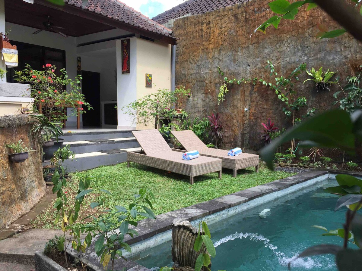 Ein-Schlafzimmer-Haus mit minimalistischem Design, das auf Reisfelder blickt. Ensuite-Badezimmer mit heißem und kaltem starkem Wasserdruck. Das Haus verfügt über eine offene Küche mit Küchenzeile und grundlegenden Küchenutensilien. Kleiner tropischer Garten mit Außendusche, ein atemberaubender privater Pool mit Sonnenterrasse. Es liegt 15 oder 20 Gehminuten vom Zentrum von Ubud, dem Palast, dem Markt und dem Affenwald entfernt. Genieße das schwimmende Frühstück am Pool, es ist auf Anfrage etwas Besonderes.