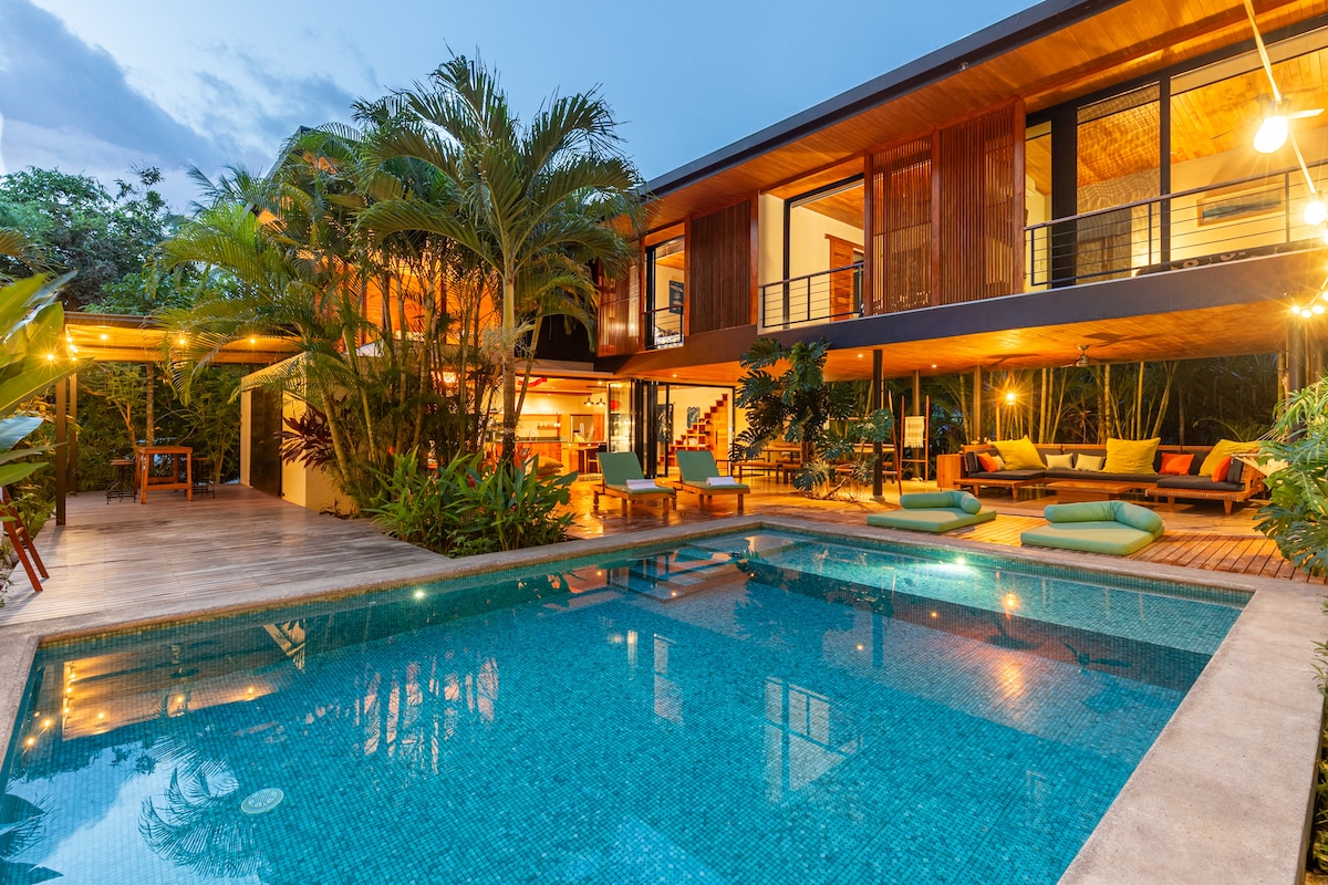 From light to layout and a well-thought-out design our family friendly setup emits a warm, inviting atmosphere. Relax in our expansive terrace or poolside in one of the hammocks under our tropical tiki hut. Walk to the stunning beaches of Mal Pais. A grocery store and microbrewery around the corner. Quiet location, yet 10 minutes away from the main bustle of town, where you'll find great dining options, cafes and fun nightlife. Near the best surf spots! Purified water on tap! WiFi 100Mbps