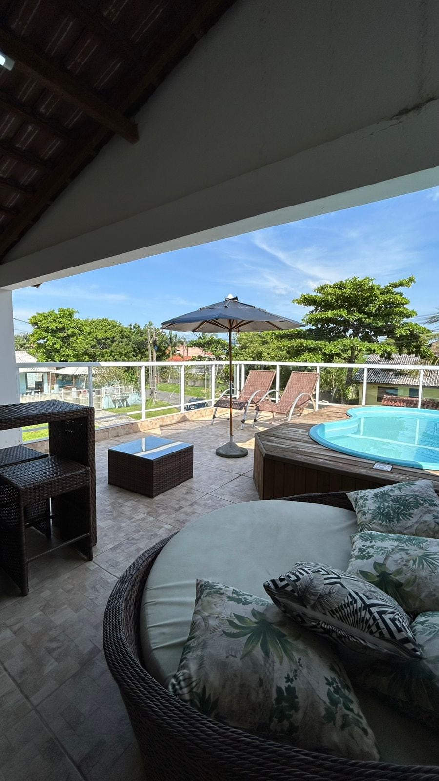 Casa em Balneário Santa Terezinha, Pontal do Paraná, a 500 metros da praia. Possui piscina privativa grande (8×4 m), quintal amplo com vaga para até 3 carros, churrasqueira e área externa ideal para famílias. São 3 quartos com ar-condicionado, 2 banheiros, sala com TV, Wi-Fi, cozinha completa, máquina de lavar e ferro de passar. Disponibiliza cadeiras de praia, guarda-sol. Local tranquilo e familiar, ideal para férias, Natal e Réveillon.