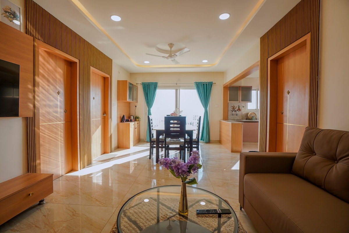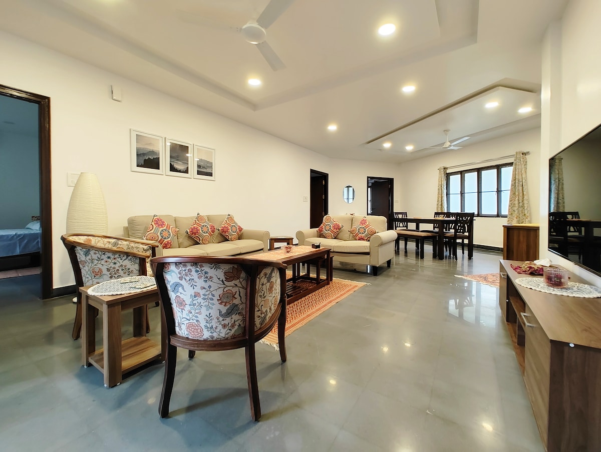 Welcome to Marrakesh, a 3,300 sq. ft. sanctuary where Mediterranean charm meets modern luxury. Located on the first floor with just one apartment per level, it offers enhanced privacy and comfort. Sunlit spaces feature graceful arches, natural textures, and elegant furnishings. Unwind in plush bedrooms, enjoy a fully equipped kitchen, and dine in style. Ideal for families, business travelers, or long stays, with 24×7 power backup for uninterrupted convenience.