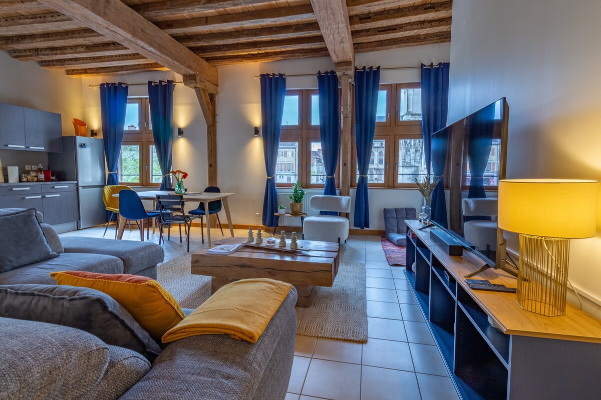 Eingebettet im Herzen des historischen Viertels von Troyes bietet diese Maisonette-Wohnung eine perfekte Mischung aus Moderne und Komfort mit einem Hauch von lokalem Charme, der durch ihre authentische Holzrahmenarchitektur verstärkt wird. Wenn du davon träumst, den Charme und die Authentizität mittelalterlicher Architektur zu erleben und gleichzeitig einen ruhigen Aufenthalt zu genießen, 13 Elégant ist perfekt für dich! Betrete diese gemütliche Maisonette-Wohnung, die geschmackvoll für eine Familie eingerichtet wurde und nur wenige Gehminuten von der Haupteinkaufsstraße entfernt liegt.