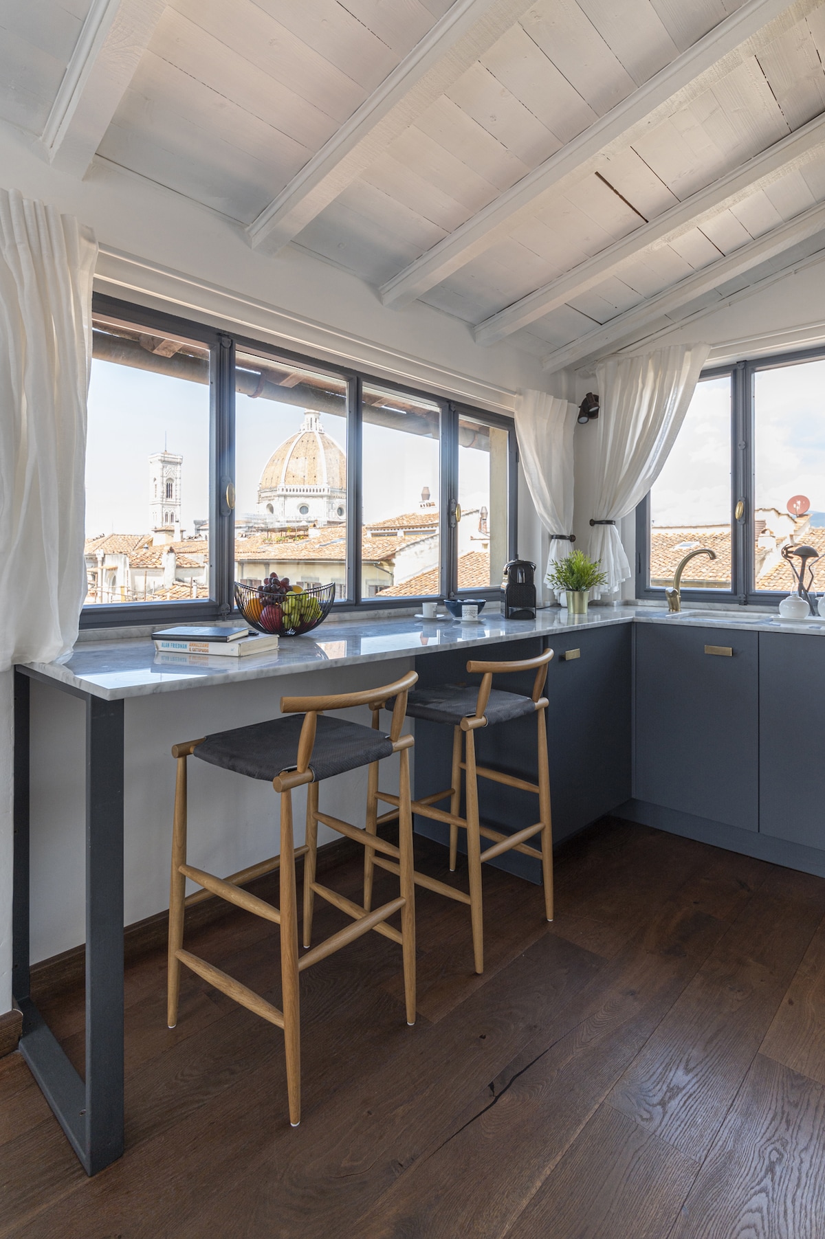 Einzigartiger und charmanter Dachboden mitten im historischen Zentrum mit herrlichem, atemberaubendem Blick auf das Stadtzentrum. Perfekt für einen romantischen Aufenthalt im Herzen von Florenz. Komplett verglast an 3/4 Wänden. Komplett renoviert mit modernen Designmöbeln. Leistungsstarke Klimaanlage, schnelles WLAN, voll ausgestattete Küche. Wenn du nach unten gehst, wirst du sofort in der schönsten Gegend des Stadtzentrums untergebracht. Achtung! Nur für junge Leute: 5. STOCK, kein AUFZUG, letzte 2 Treppen in einer schmalen Wendeltreppe.
