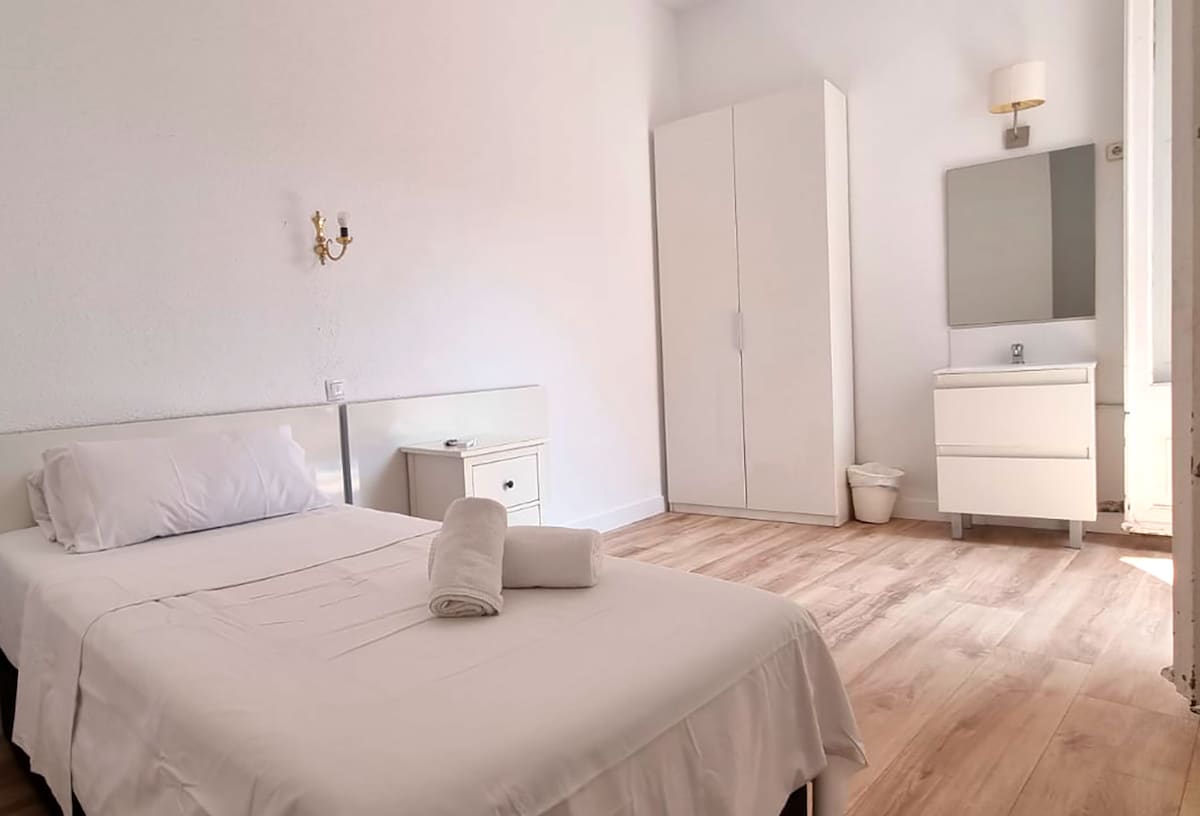 Dreibettzimmer mit Balkon/Terrasse und Gemeinschaftsbad (Frühstück inklusive) Die Dreibettzimmer sind helle, klimatisierte Zimmer mit einem Balkon und einem Flachbild-TV. Sie haben Dusche und Waschbecken im Zimmer, aber eine gemeinsame Toilette auf dem Flur. Dieses Zimmer verfügt über ein Schlafsofa für einen Erwachsenen. Einige verfügen über einen kleinen Balkon mit Blick auf die Girona-Straße und andere über eine kleine Terrasse über einem großen Innenhof. Alle sind sehr hell. Kurtaxen 5,5 € pro Person/Nacht sind nicht im Preis enthalten.