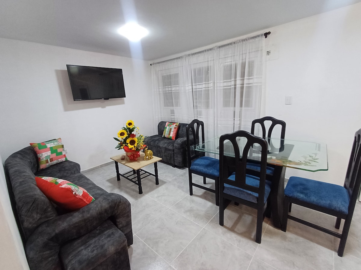 Apartamento ubicado en condominio de zona céntrica de la ciudad, a 5 cuadras de la Basílica. Estarás cerca de todo durante tu estadía (supermercados, restaurantes, comercio). Pasarás una agradable estancia. Cuenta con 3 habitaciones, cama Queen, cama doble y dos camas sencillas; 2 baños con agua caliente, zona de labores, 2 closets, ventilador en cada habitación, cocina con todos los utensilios esenciales, Smart Tv y Wifi. Nota: Parqueadero privado sujeto a disponibilidad con pago adicional