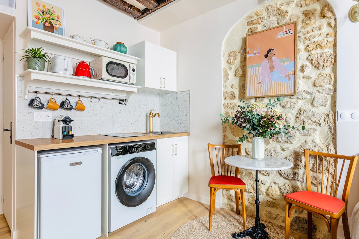 Willkommen in deinem Pariser Refugium im Herzen von Le Marais! Dieses stilvolle 18 m ² große Studio verbindet authentischen Charme mit modernem Komfort: freiliegende Holzbalken, eine schöne Steinmauer und viel natürliches Licht von großen Fenstern mit Blick auf einen ruhigen Innenhof. Es befindet sich in der 3. Etage eines ruhigen, sicheren und historischen Gebäudes. 🌟 Perfekt für ein Paar, Alleinreisende oder Geschäftsreisende, die das authentische Pariser Leben mit Stil erleben möchten. Metro Bastille: Linie 1, 5, 8 Metro Sully Morland: Linie 7