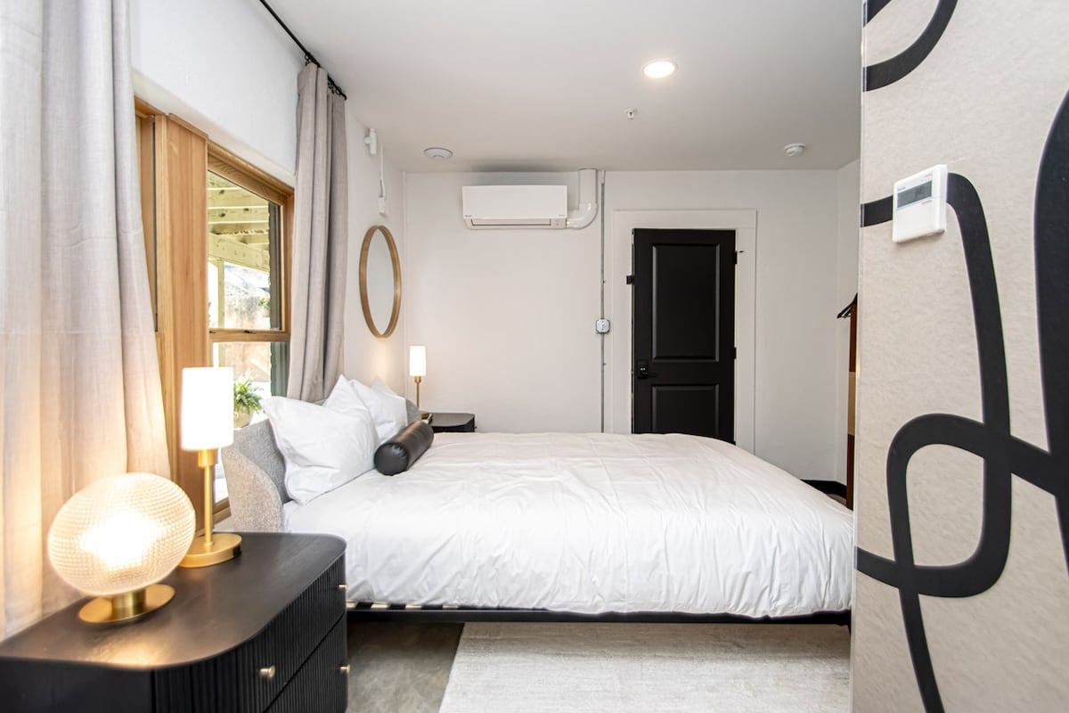 Gorgeous building sits in the CENTER of historic DOWNTOWN Hot Springs. Its prime location, slice of history (its on the National Register of Historic Places) & elevated style make it the perfect getaway! 1 of 12 rooms in building Walk to Bathhouses, Trails, Restaurants! KEY FEATURES: ☀ Queen-sized bed w/ high end Centium Satin linens ☀ Large outdoor patio area w/ seating and fire pits ☀ 43” Roku TV w/ Hulu + live ☀ Fiber internet ☀ SMEG coffee maker & SMEG fridge ☀Total renovation in 2024