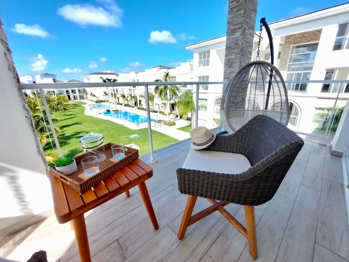 Wache jeden Tag mit einem entspannenden Blick auf den Pool direkt vor dir auf. Diese elegante Wohnung mit zwei Schlafzimmern verbindet Komfort und Stil und hilft dir, vom Alltag abzuschalten. In einer Wohnanlage mit Pools, Whirlpools, einem Fitnessraum und Zugang zum künstlichen Strand von Vistacana findest du Restaurants, Supermärkte und einen Golfplatz nur wenige Schritte entfernt. Außerdem sind Sie nur 5 Minuten von der Innenstadt von Punta Cana entfernt, wo Einkaufszentren, Coco Bongo, Restaurants und Wasserparks auf Sie warten.